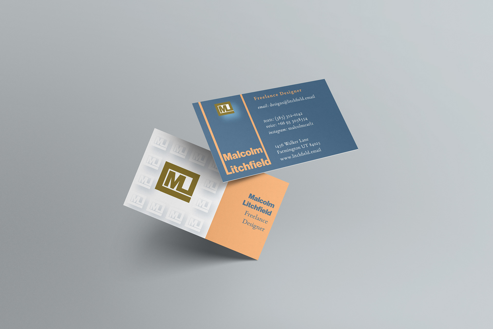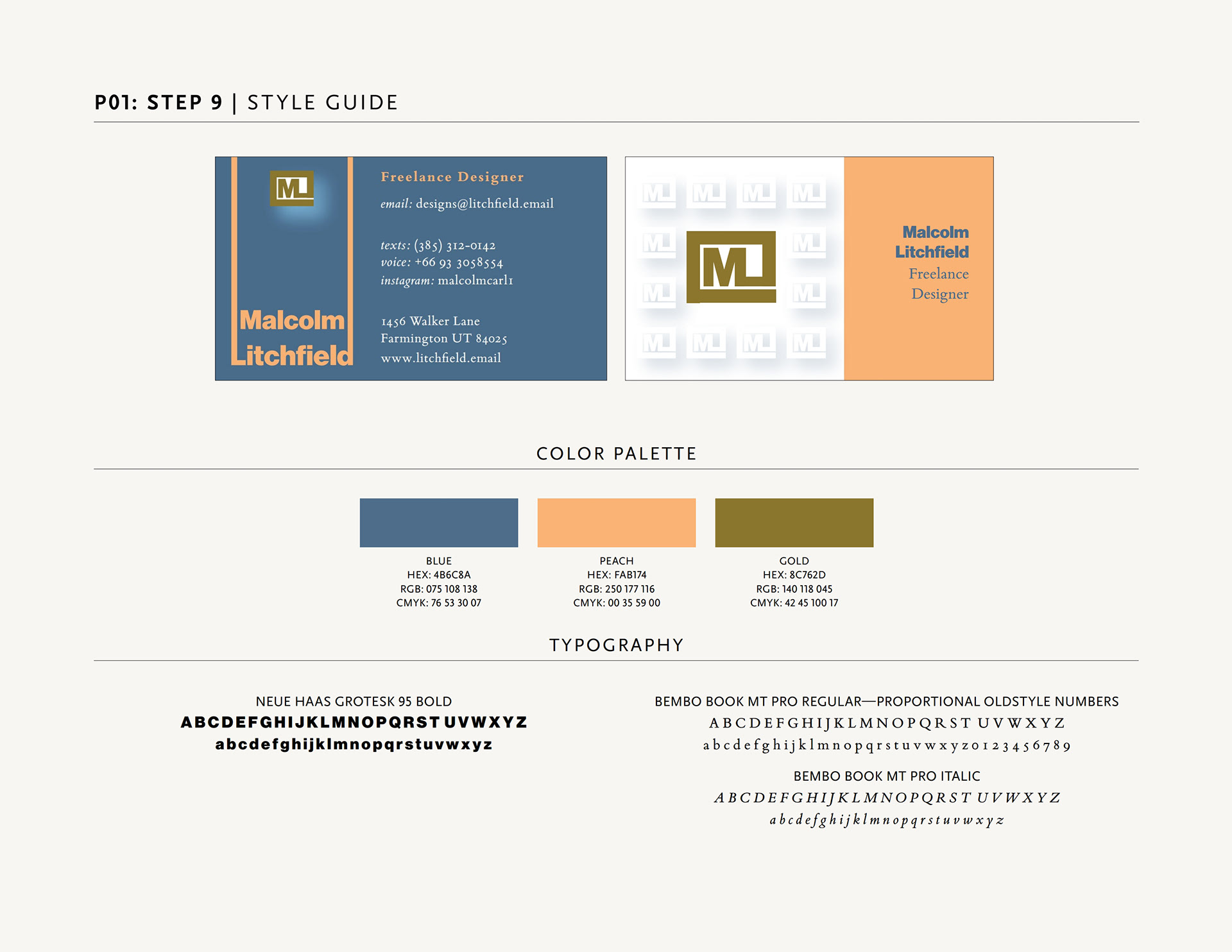 The project was to create a business card that relied exclusively on type for identification using exactly 3 inks/colors. I loved working with Neue Haas Grotesk to come up with a logo with my initials. The color choices were for readability and so the back and front would complement without copying each other. By extending the ascenders of the first and last letter of my last name, I was able to create a better grid for the overall presentation while giving lots of breathing room for the logo itself (highlighted with a white shadow). The tone-on-tone logos on the back use the same blue as the front for the shadow, giving a slightly softer feel than if I used the standard black shadow.