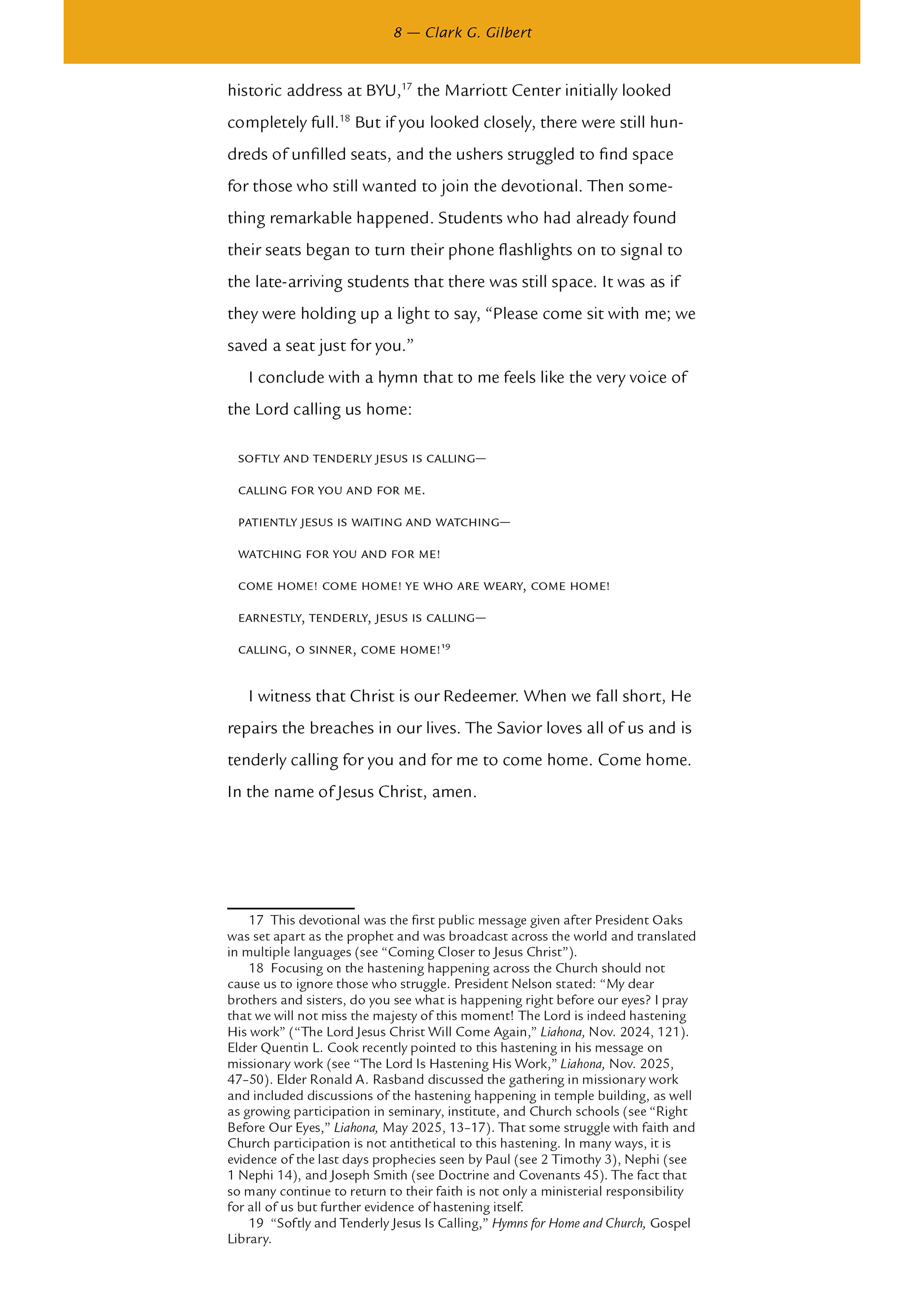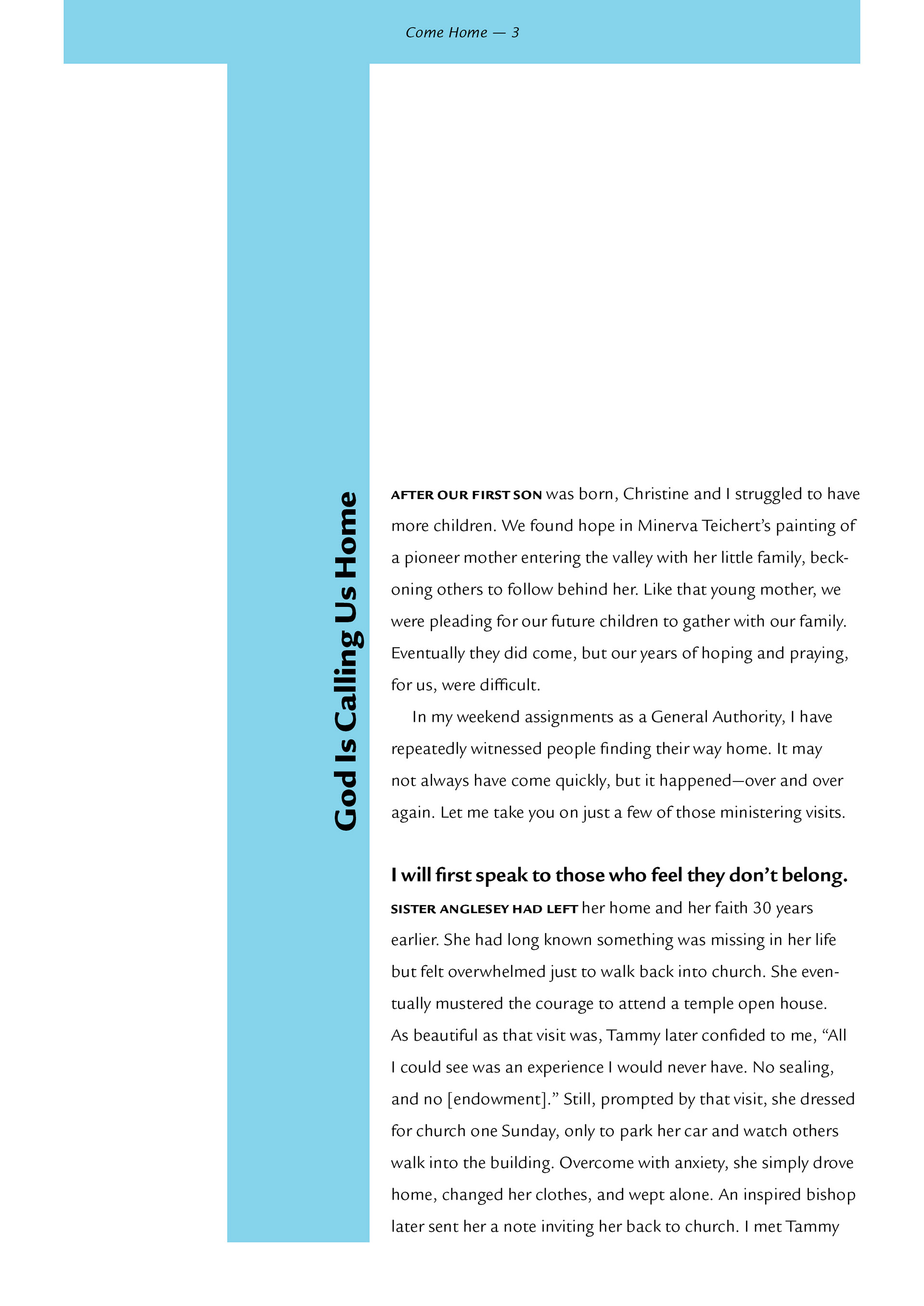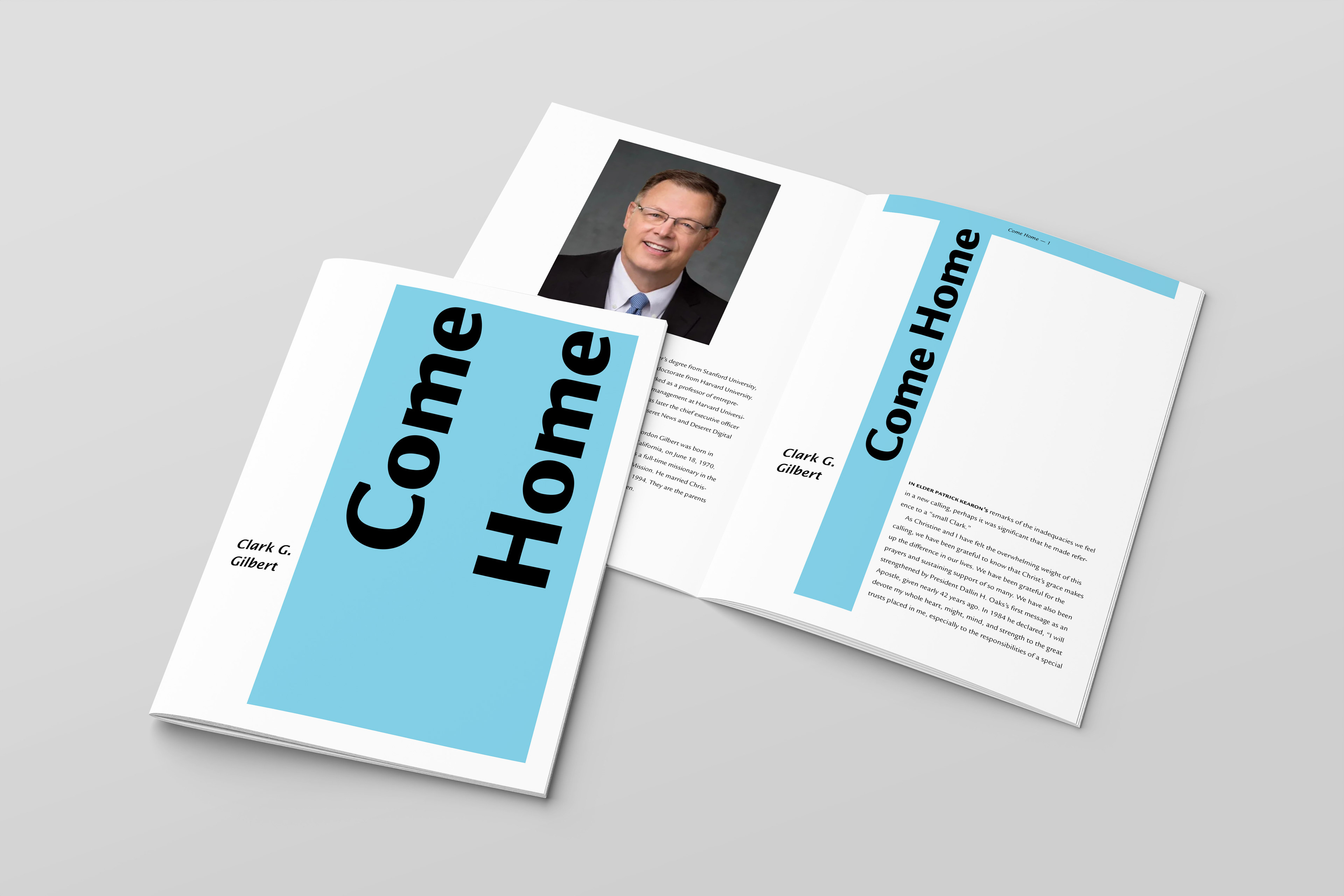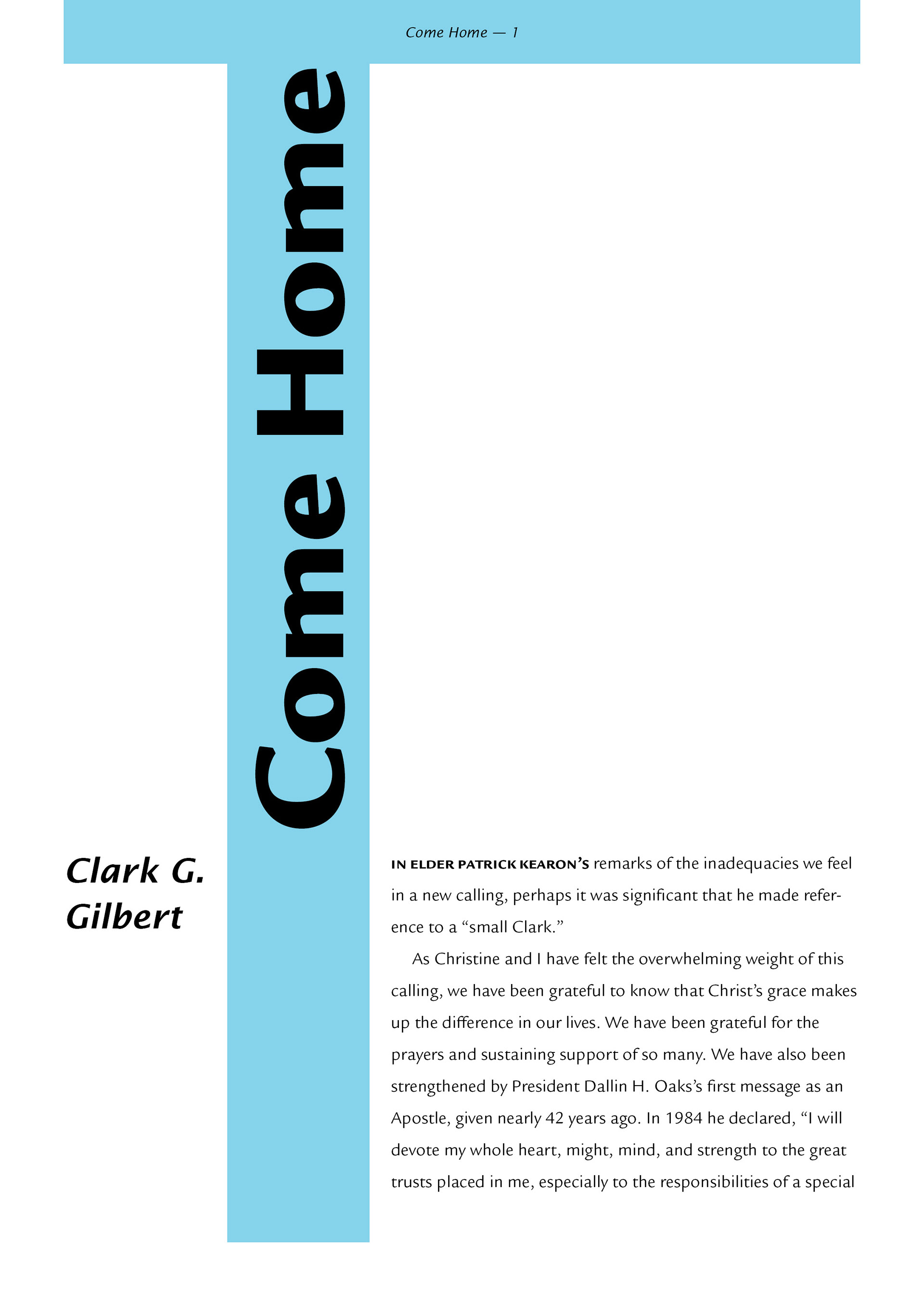 This is a gift booklet of Elder Clark G. Gilbert's first address as a member of the Quorum of 12 Apostles. It focuses on Christ welcoming everyone back to him—to come home.