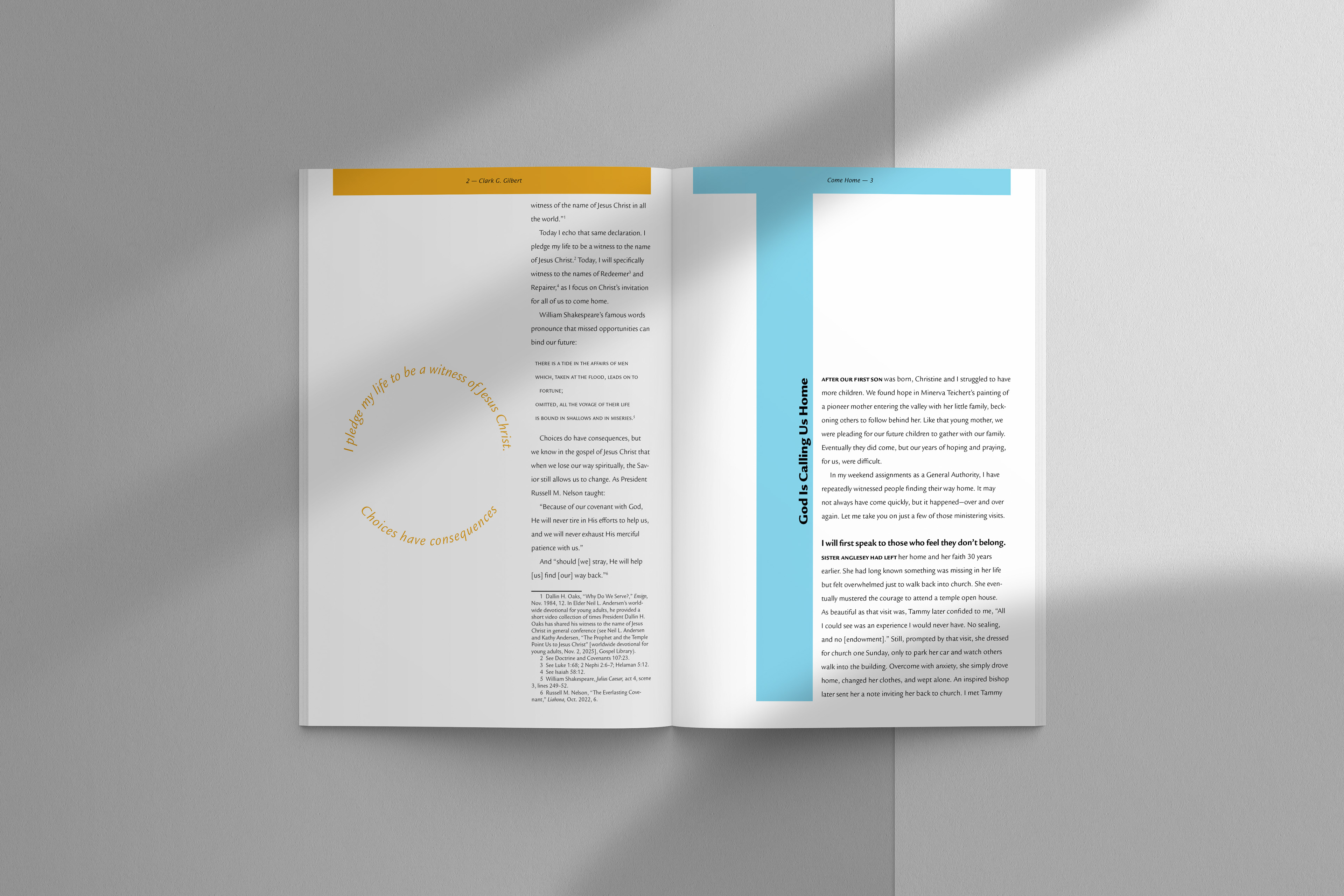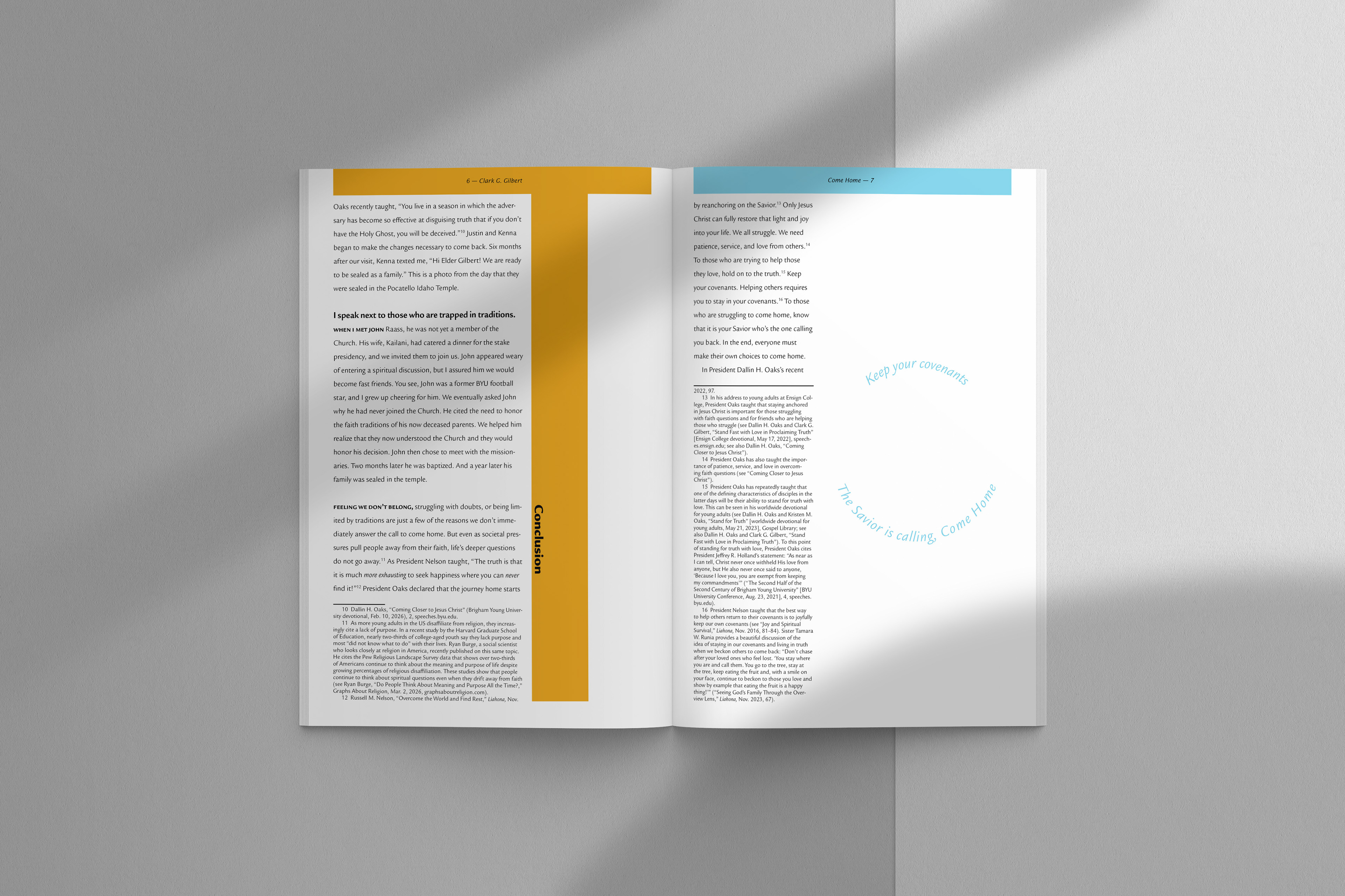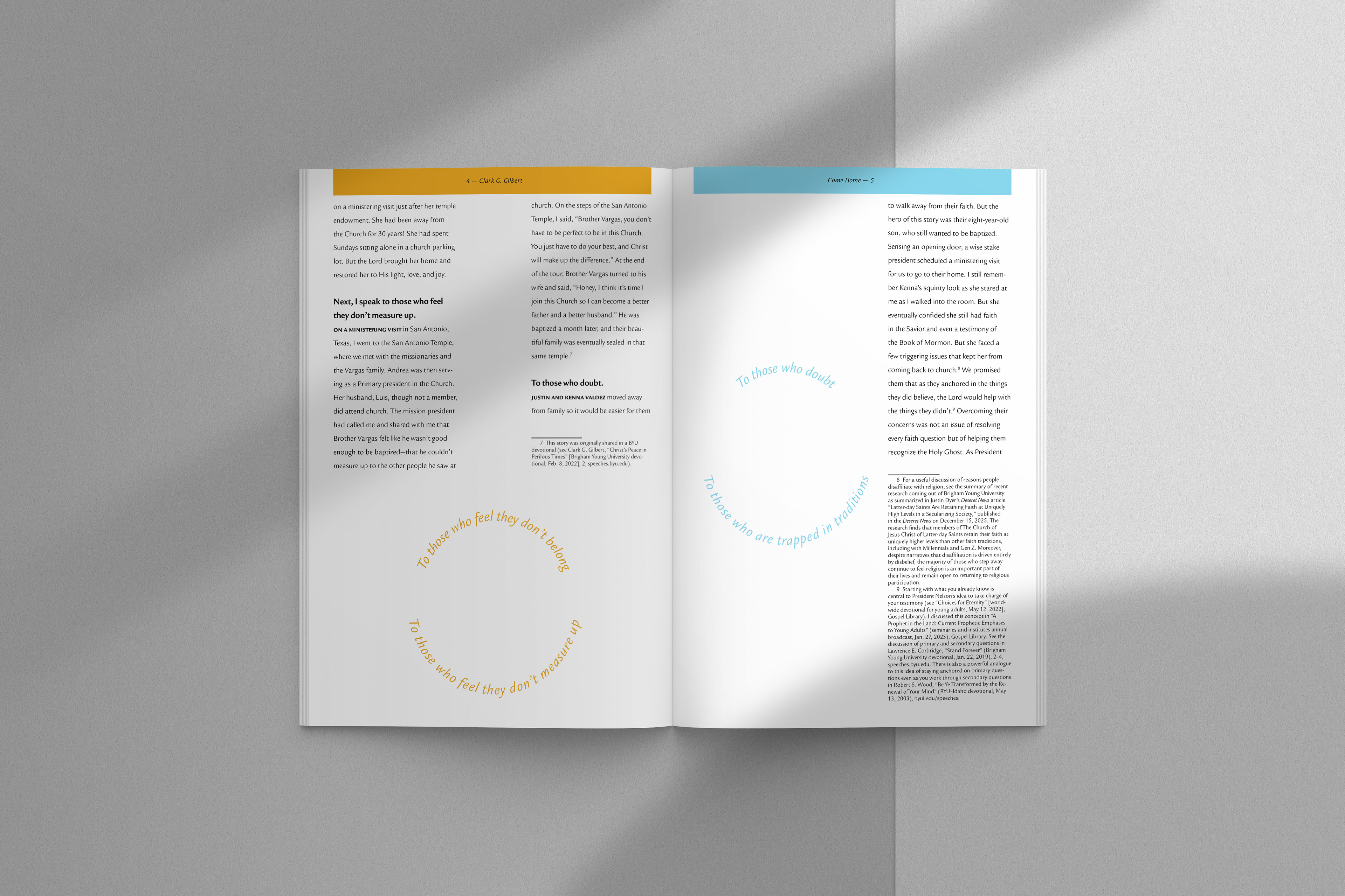 This is a gift booklet of Elder Clark G. Gilbert's first address as a member of the Quorum of 12 Apostles. It focuses on Christ welcoming everyone back to him—to come home.