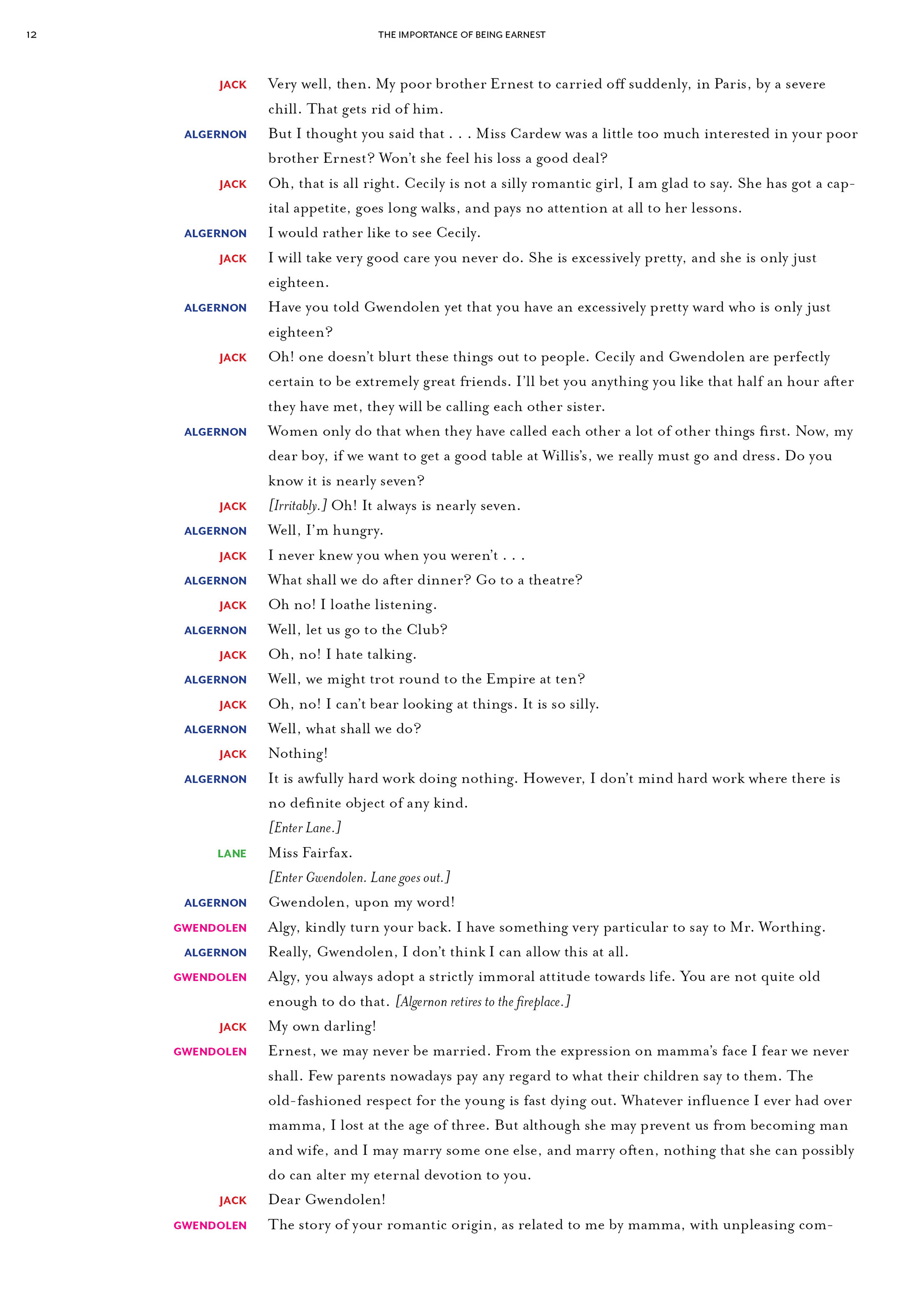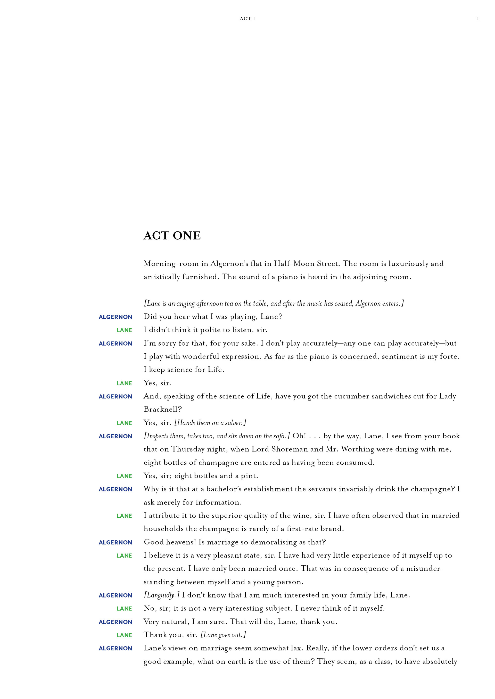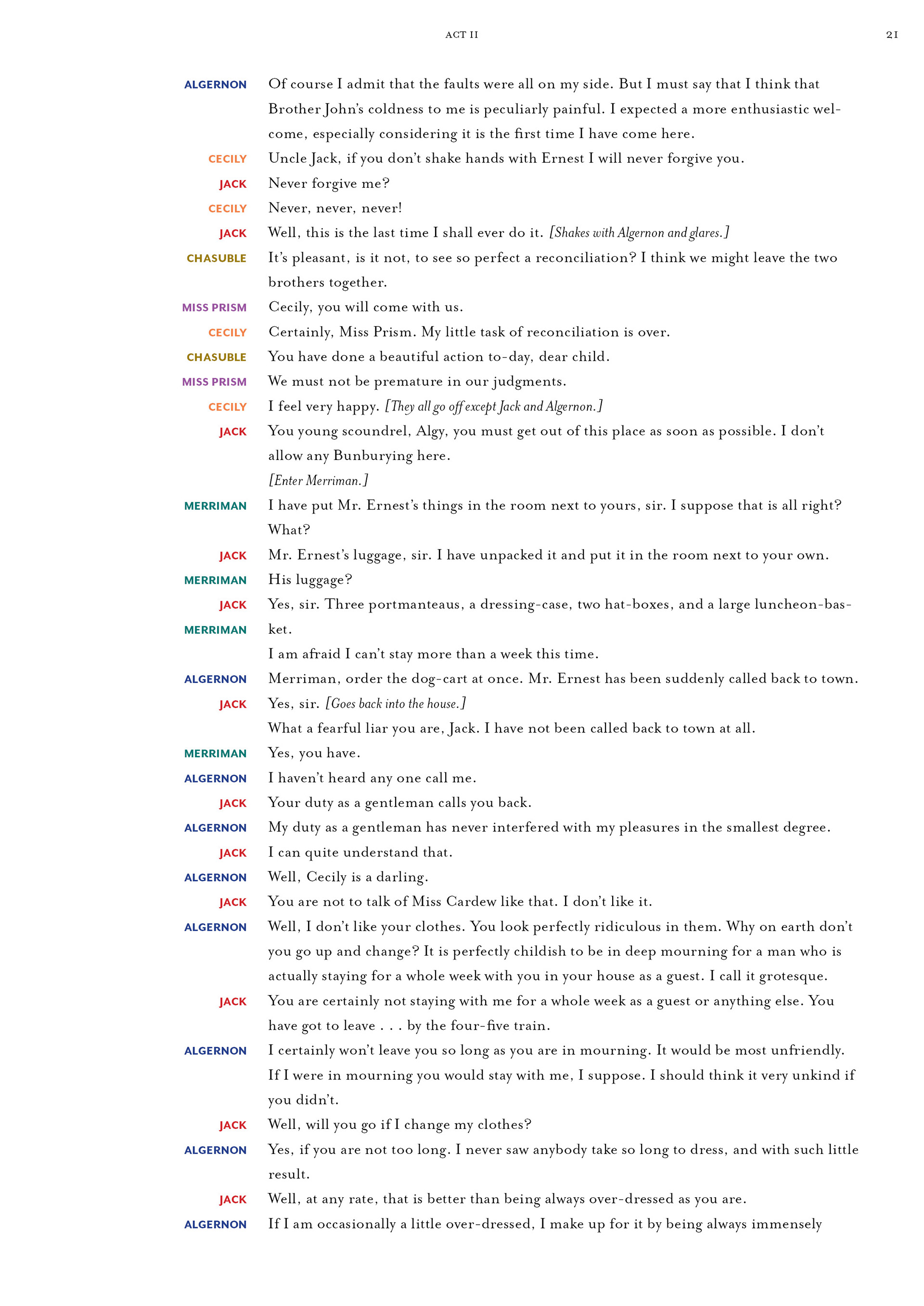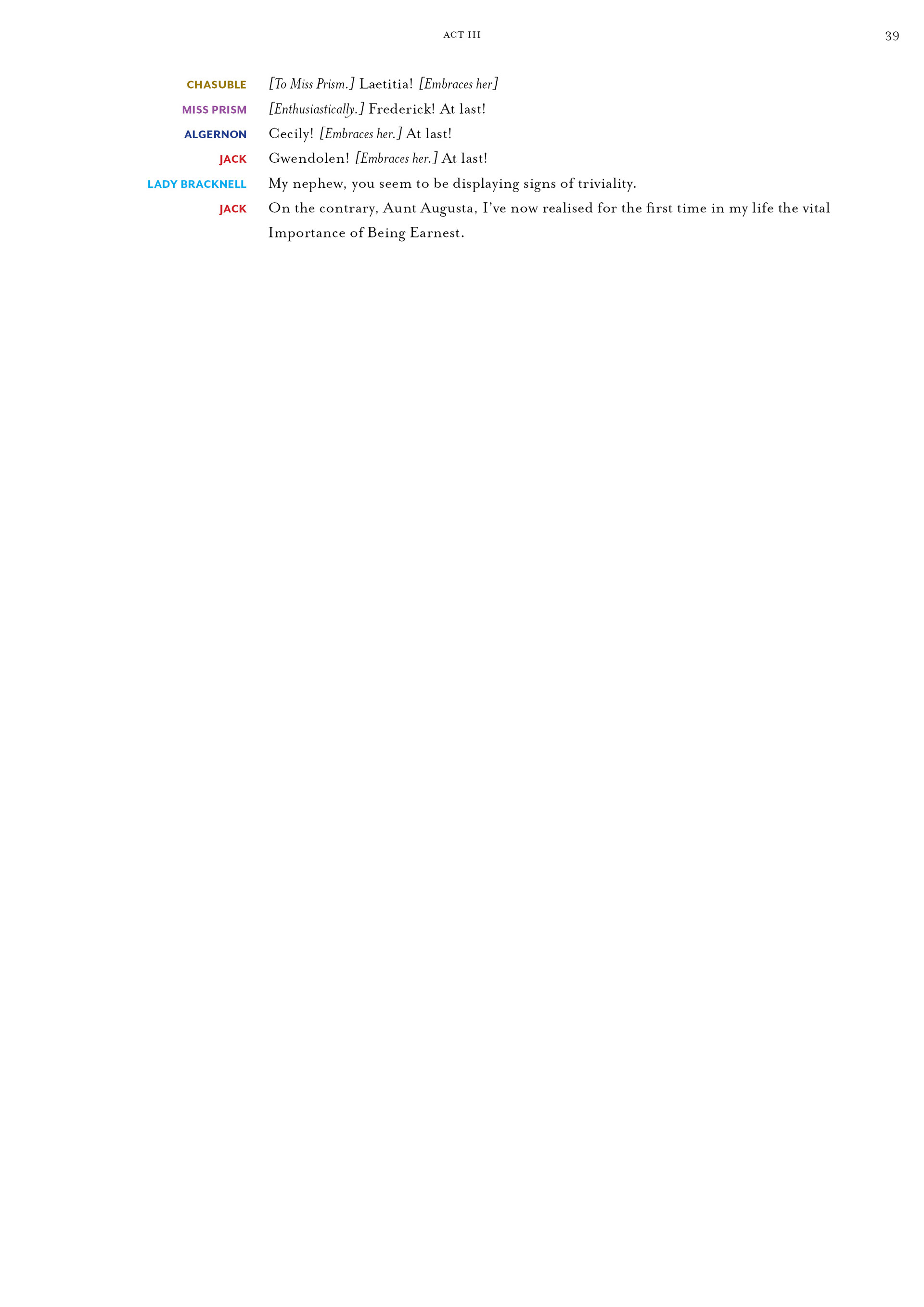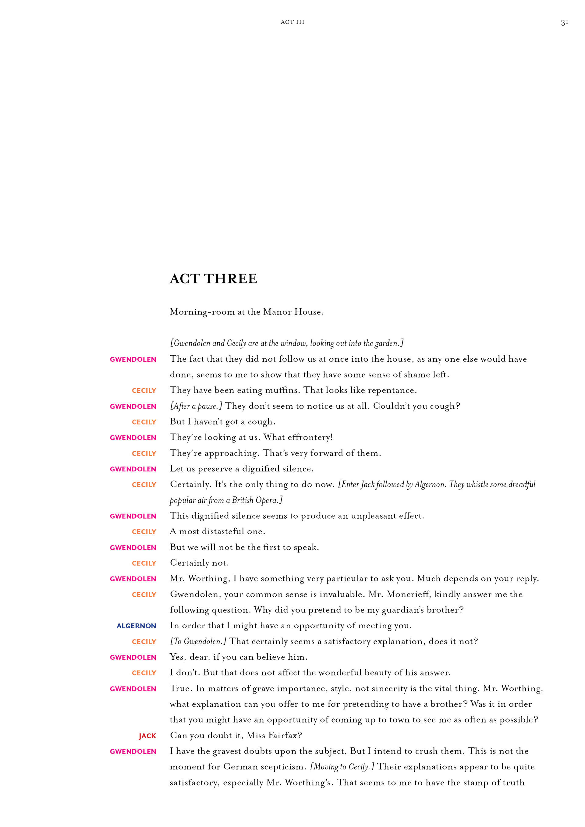 I wanted the challenge of typesetting something longer than just a speech and more complex than just flowing text. I decided to set Oscar Wilde's play "The Importance of Being Earnest." Typefaces used were Mr. Eaves and Mrs. Eaves. The characters have individual colors assigned to them to facilitate reading and understanding.