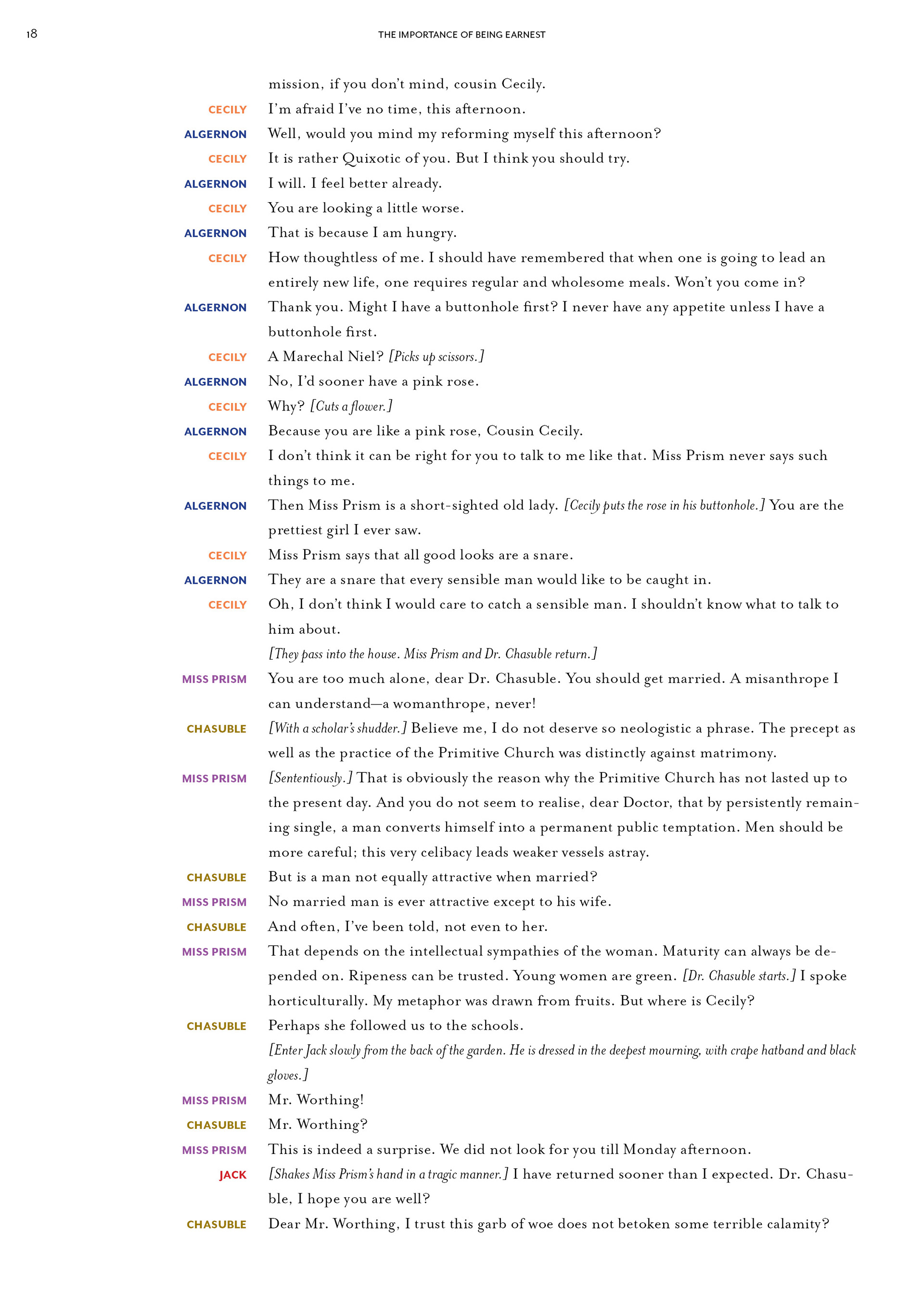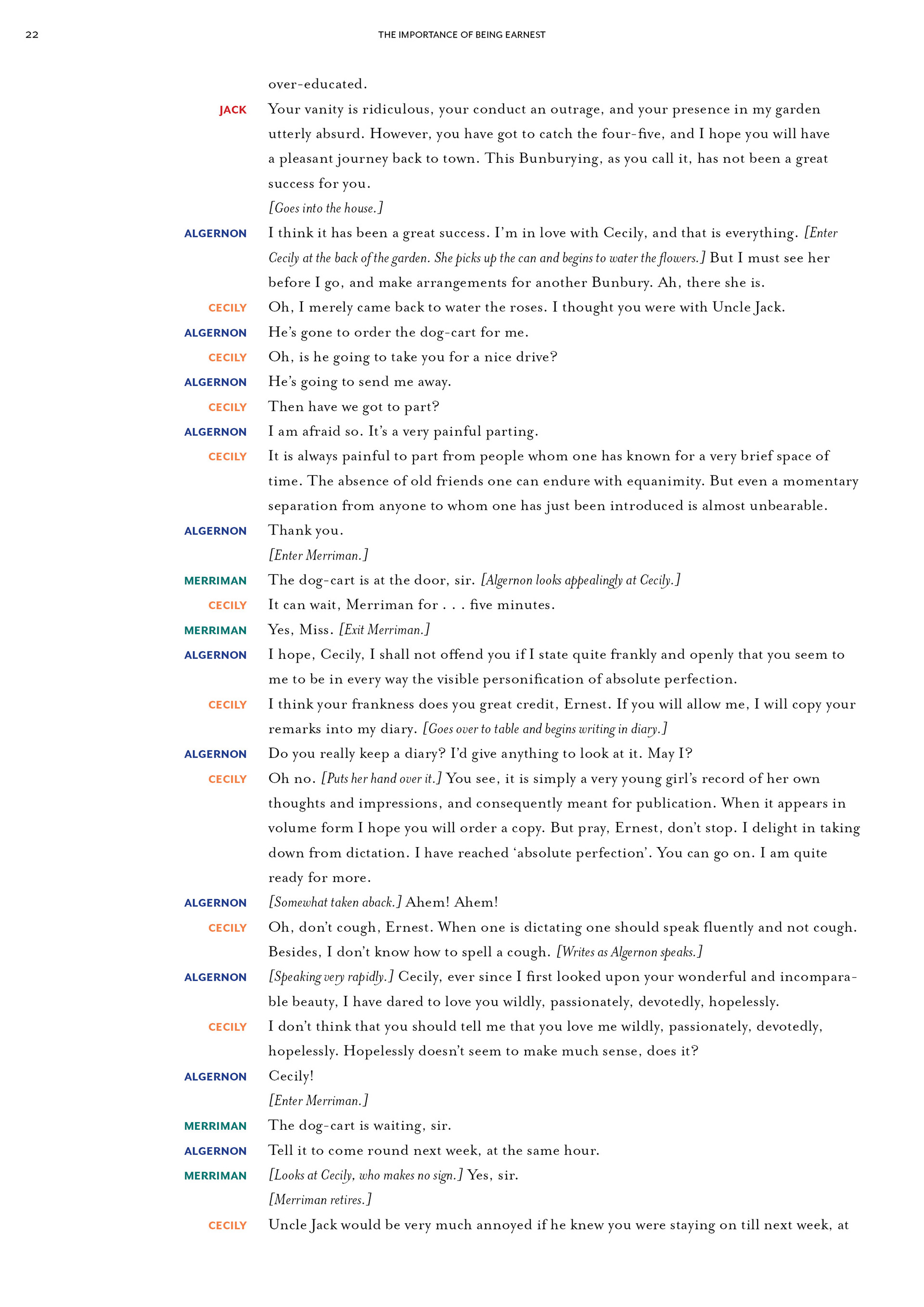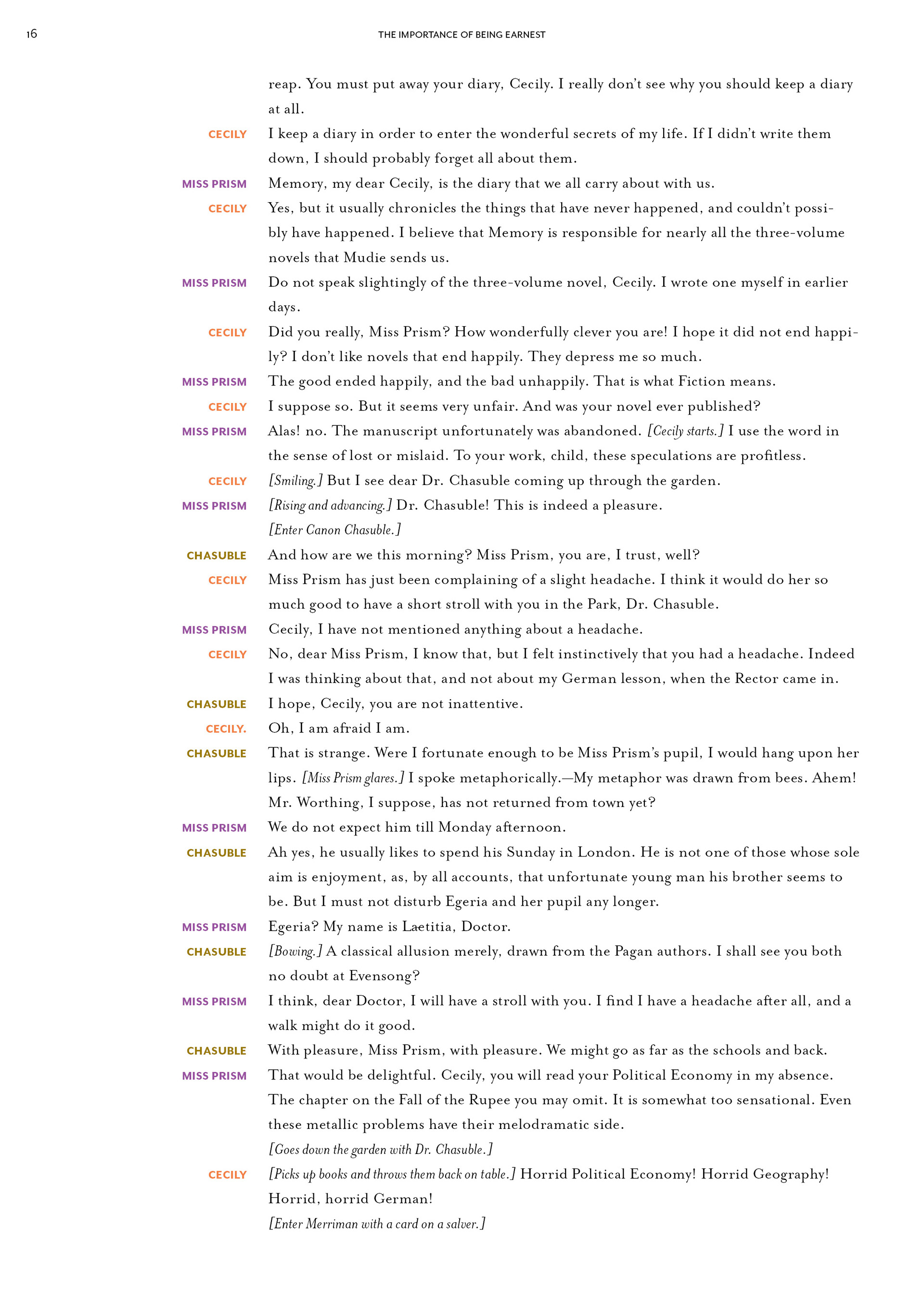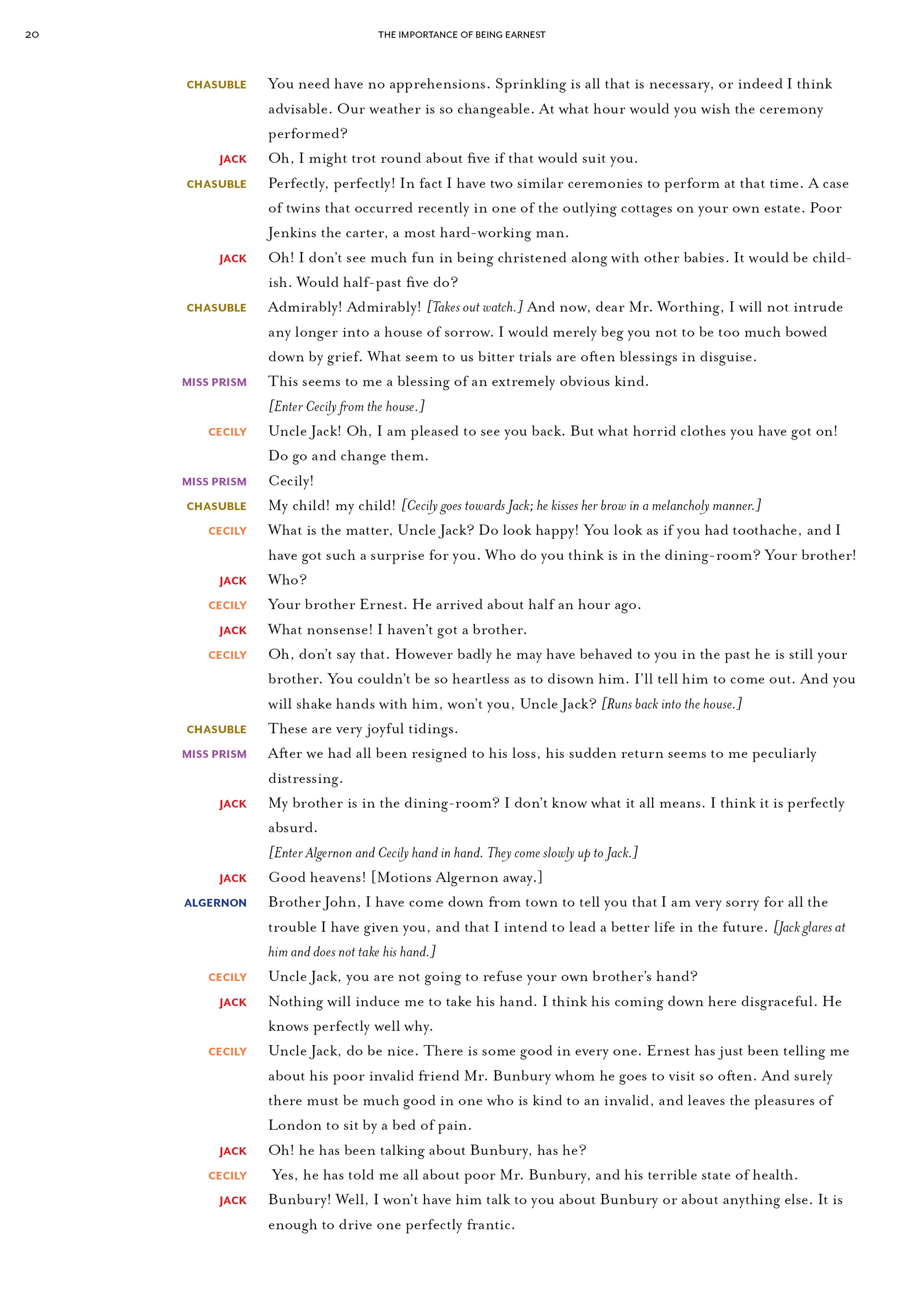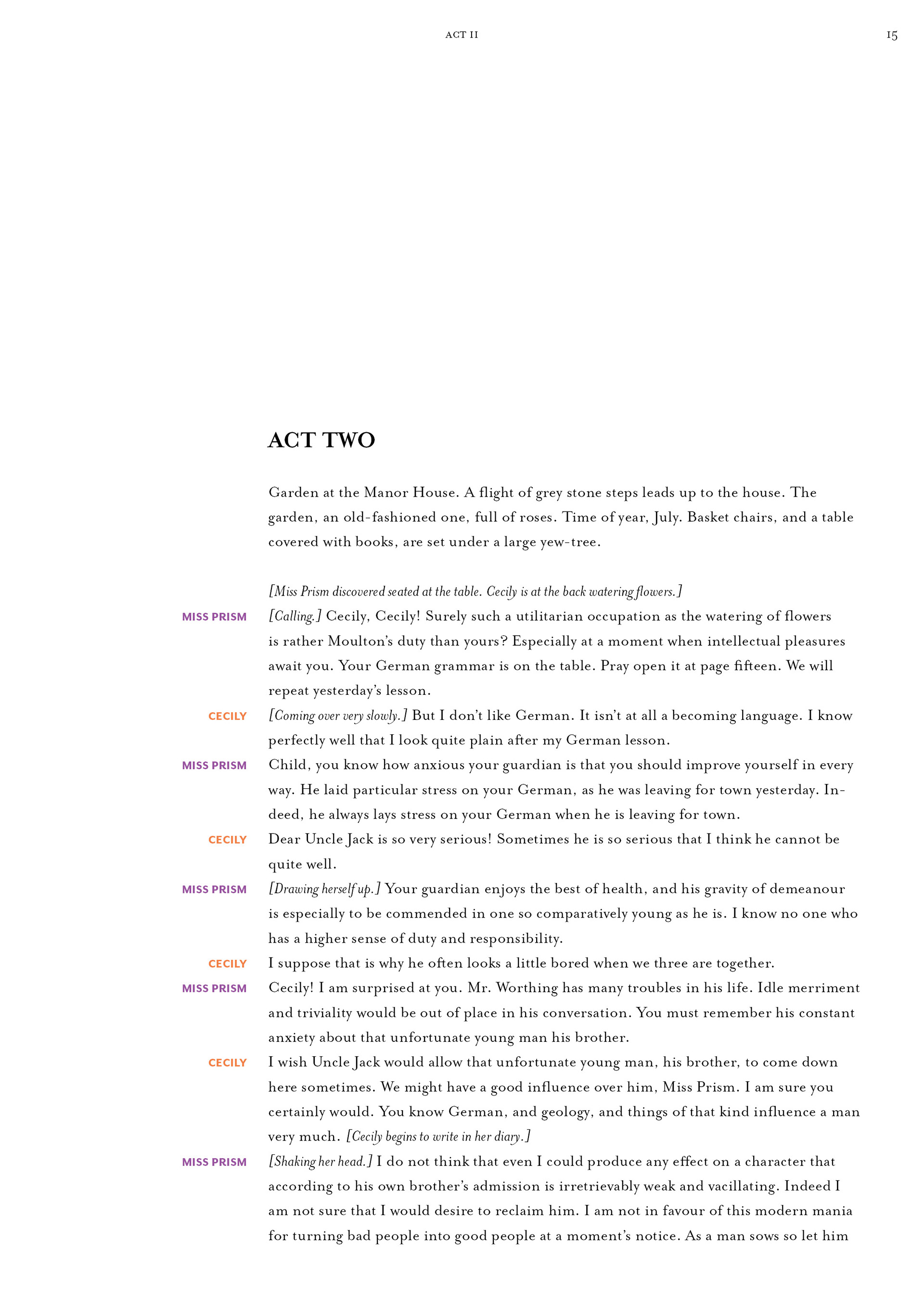 I wanted the challenge of typesetting something longer than just a speech and more complex than just flowing text. I decided to set Oscar Wilde's play "The Importance of Being Earnest." Typefaces used were Mr. Eaves and Mrs. Eaves. The characters have individual colors assigned to them to facilitate reading and understanding.