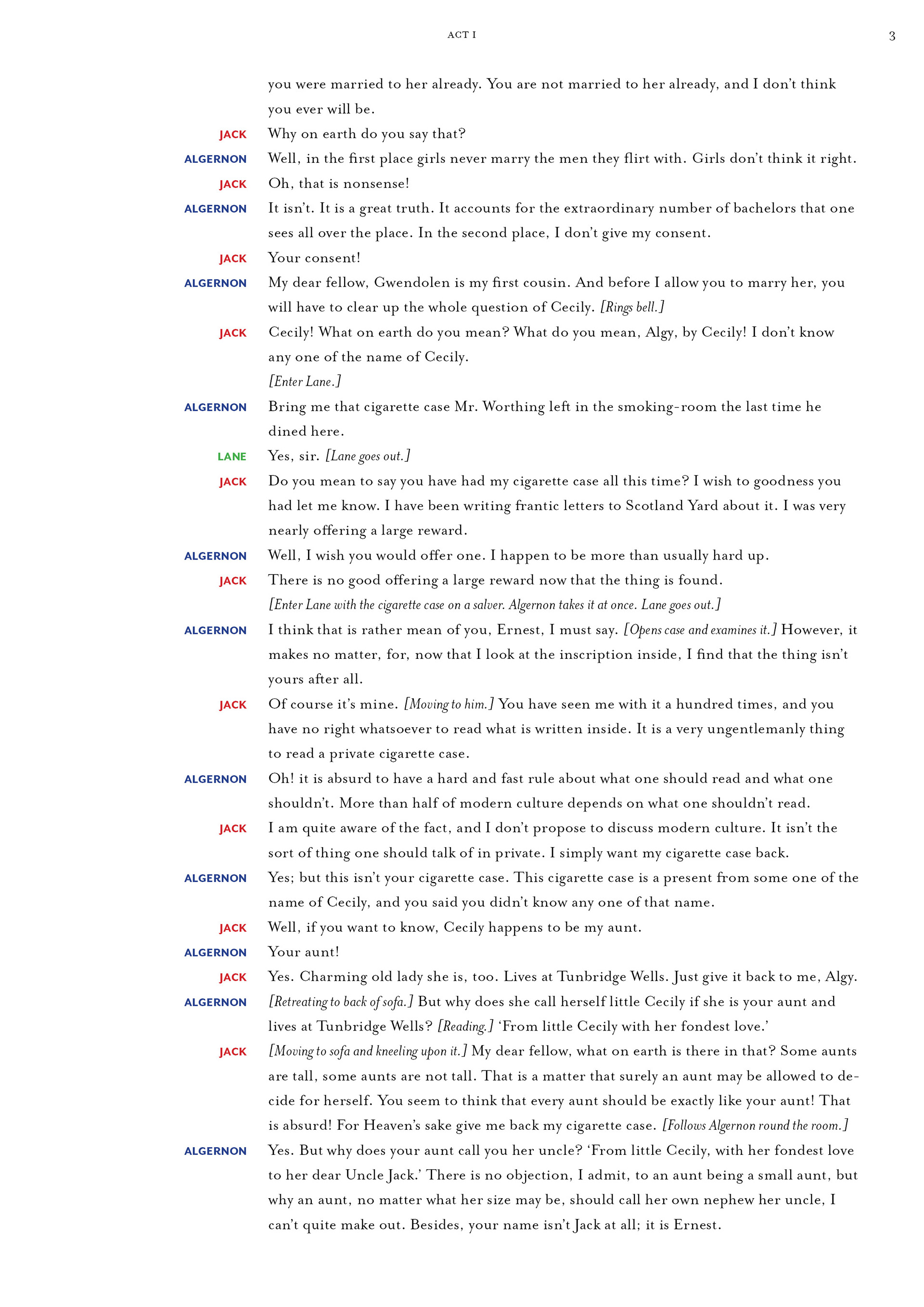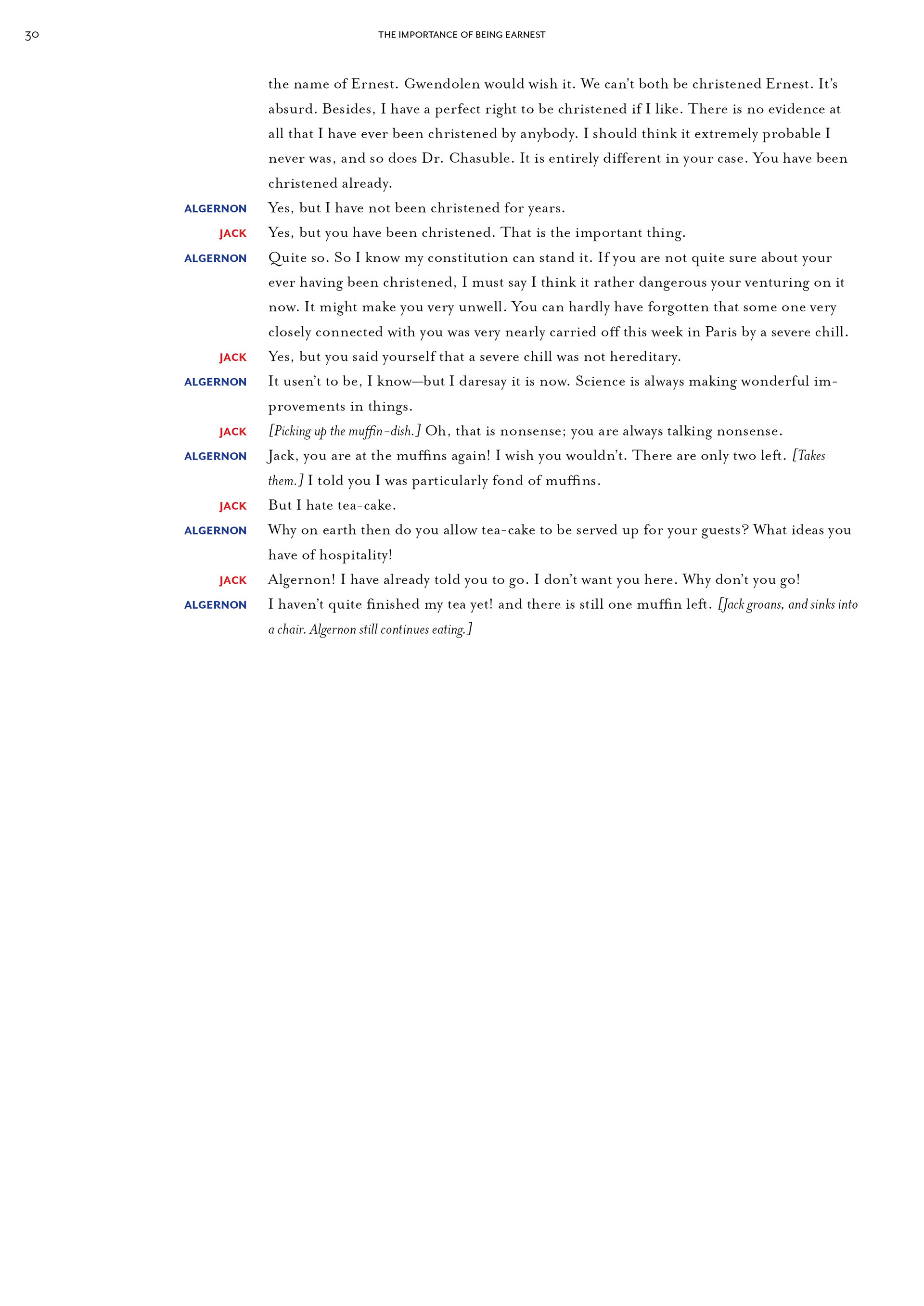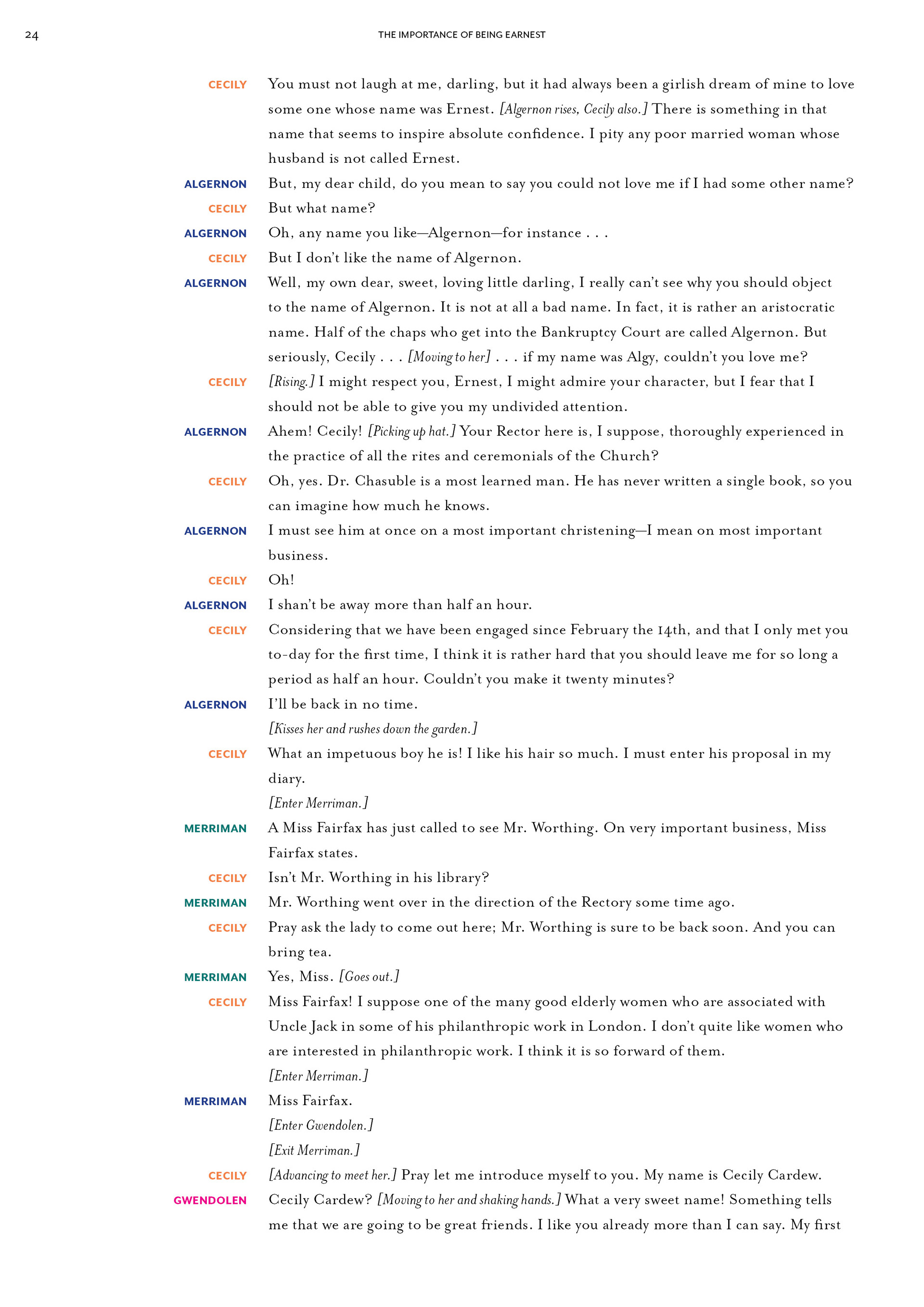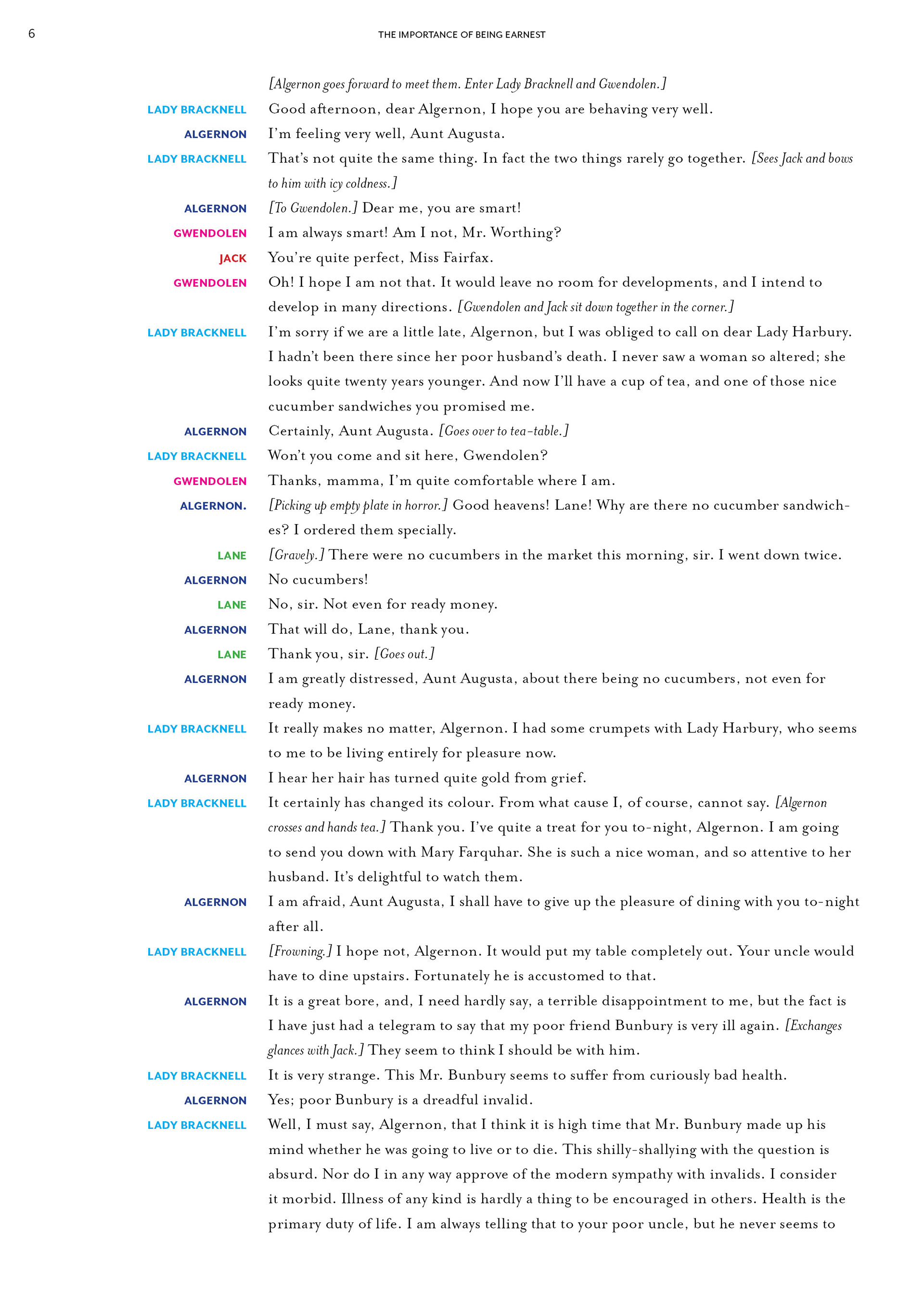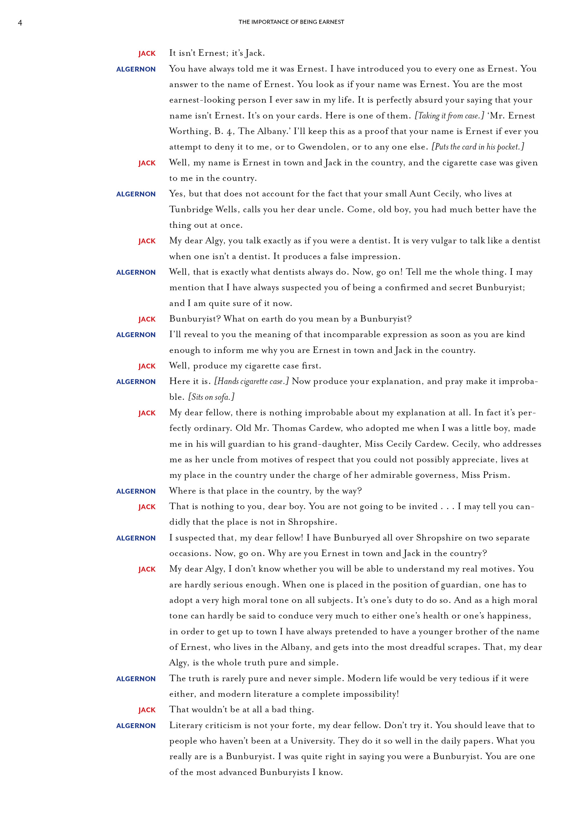 I wanted the challenge of typesetting something longer than just a speech and more complex than just flowing text. I decided to set Oscar Wilde's play "The Importance of Being Earnest." Typefaces used were Mr. Eaves and Mrs. Eaves. The characters have individual colors assigned to them to facilitate reading and understanding.