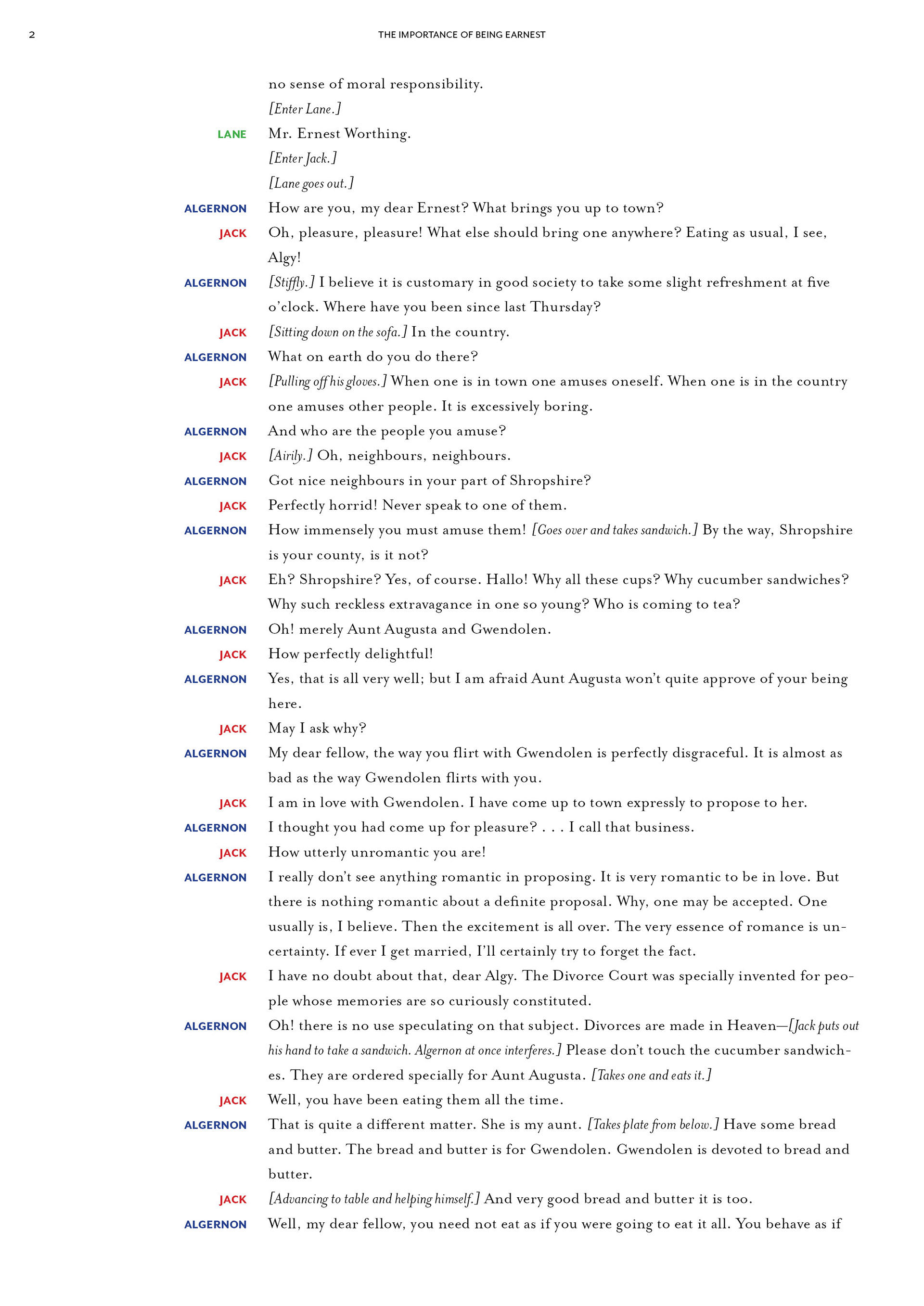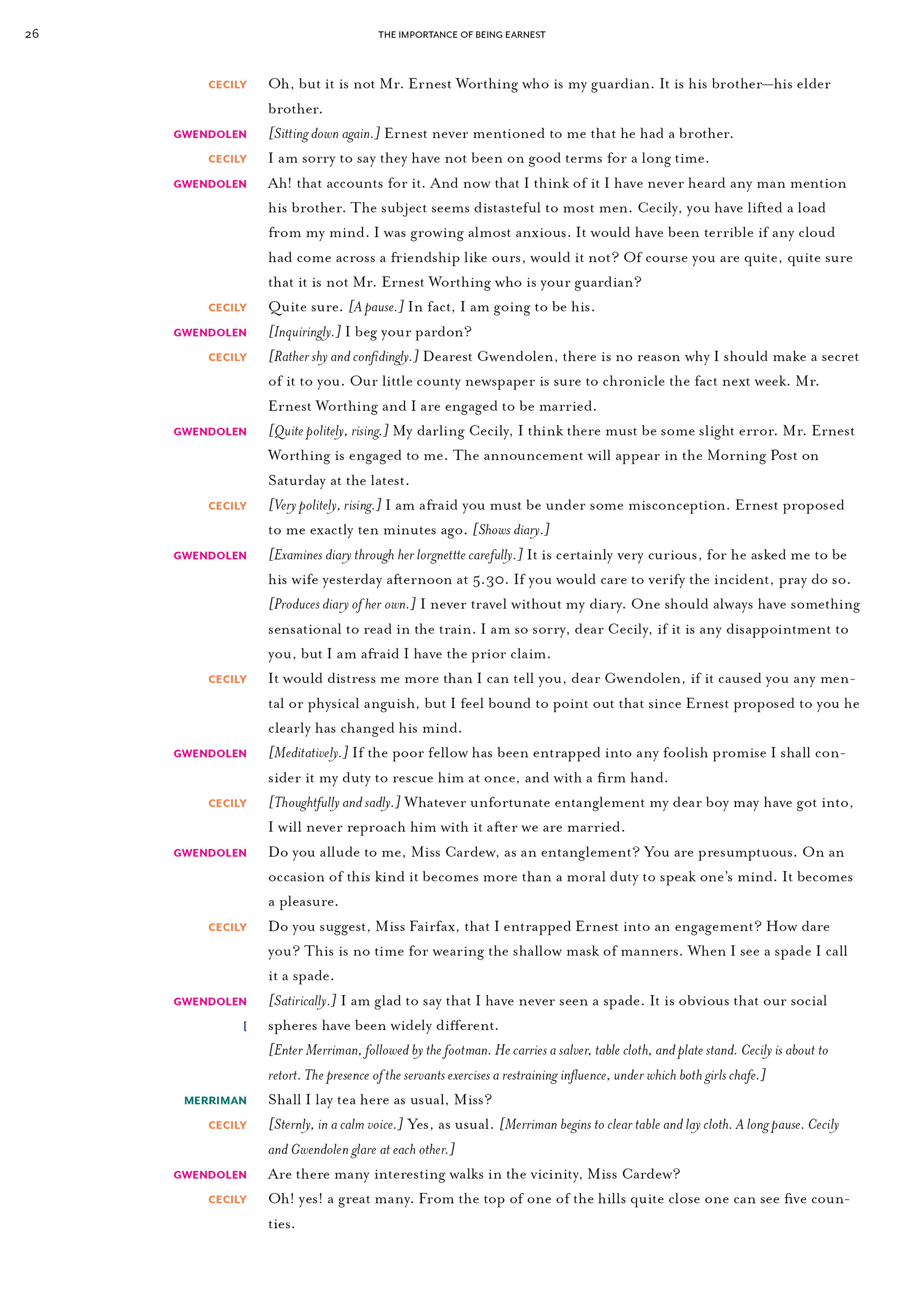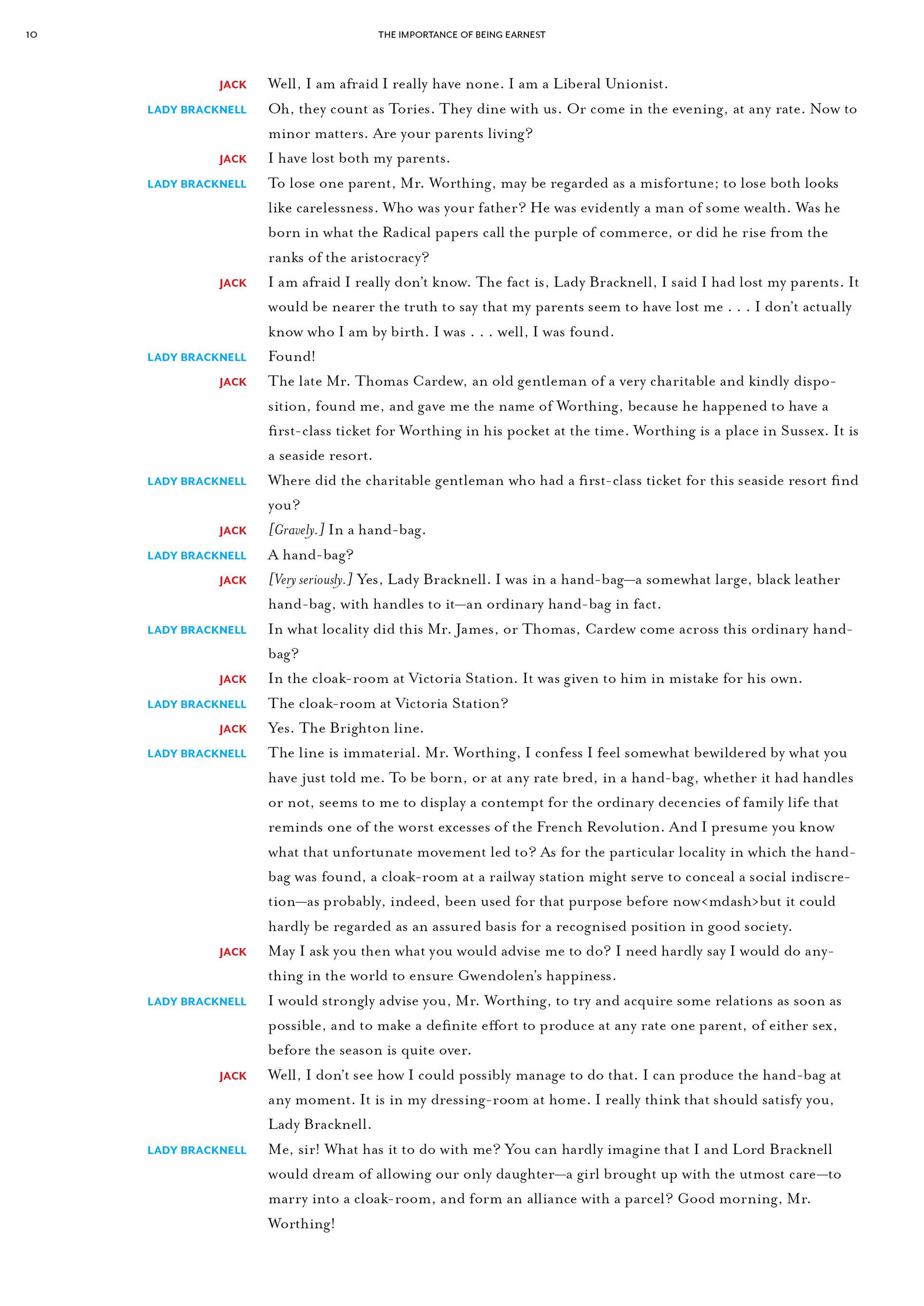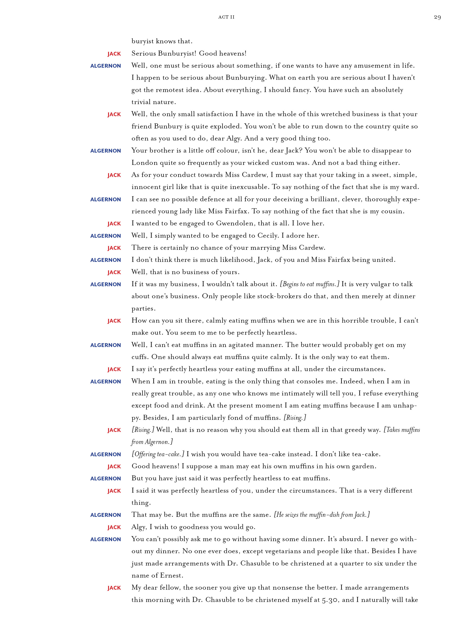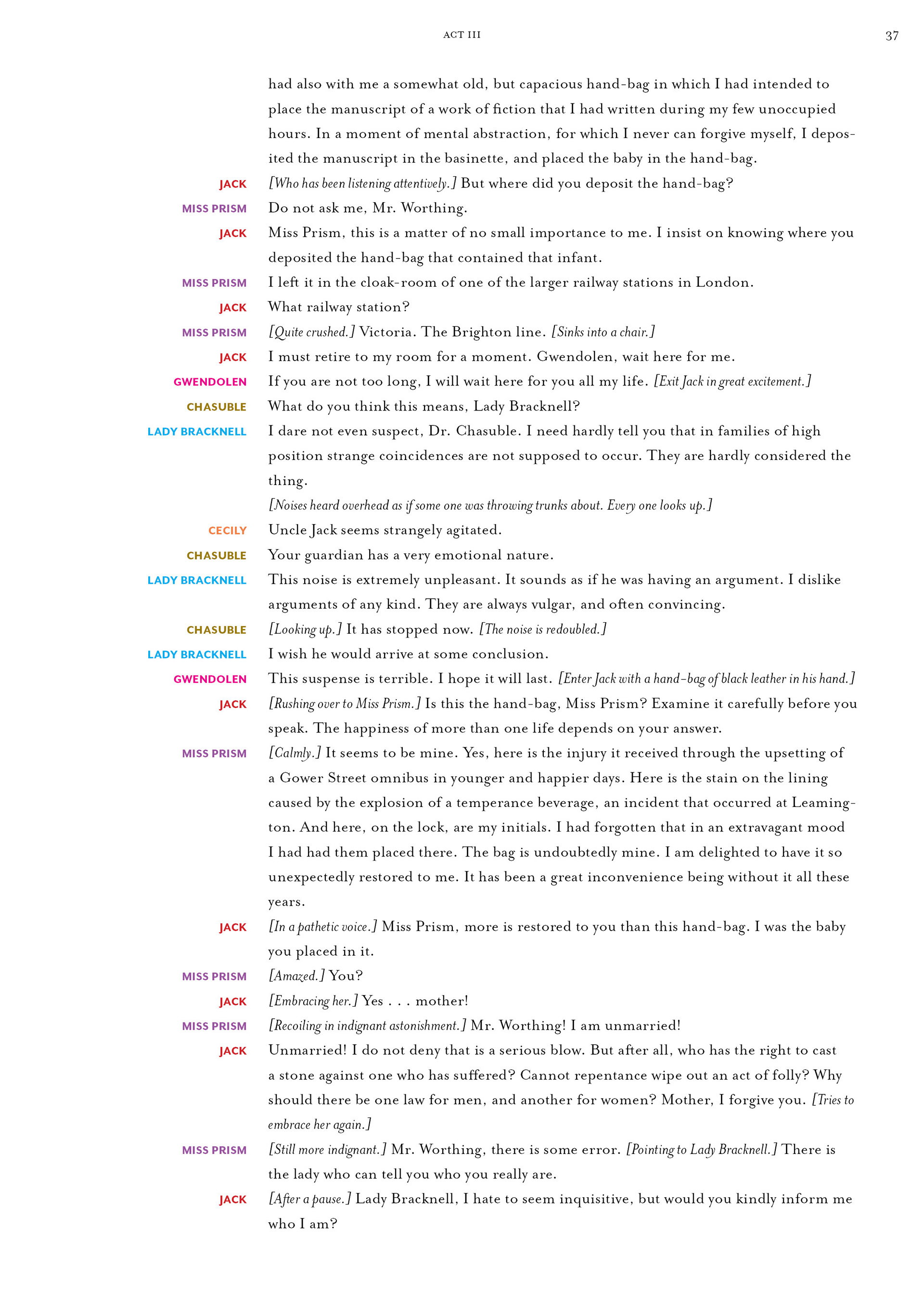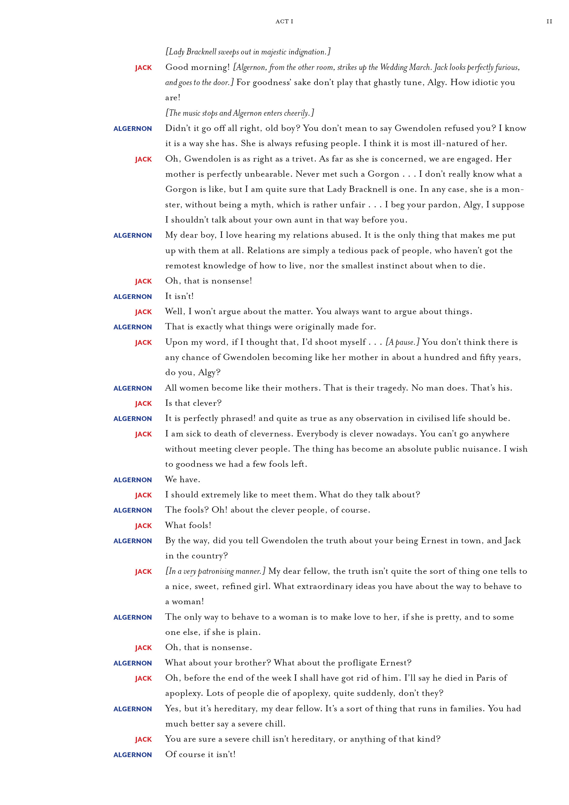 I wanted the challenge of typesetting something longer than just a speech and more complex than just flowing text. I decided to set Oscar Wilde's play "The Importance of Being Earnest." Typefaces used were Mr. Eaves and Mrs. Eaves. The characters have individual colors assigned to them to facilitate reading and understanding.