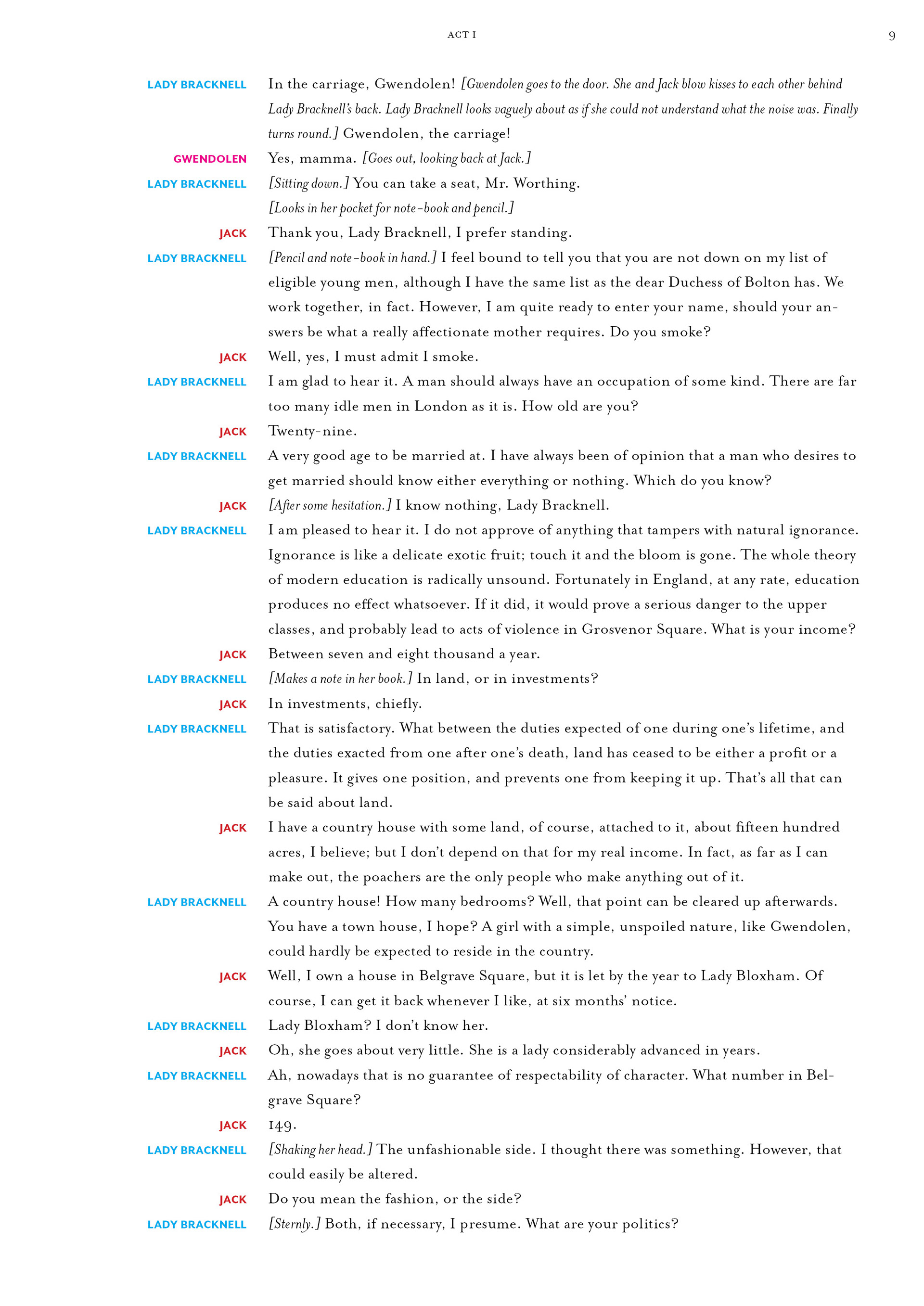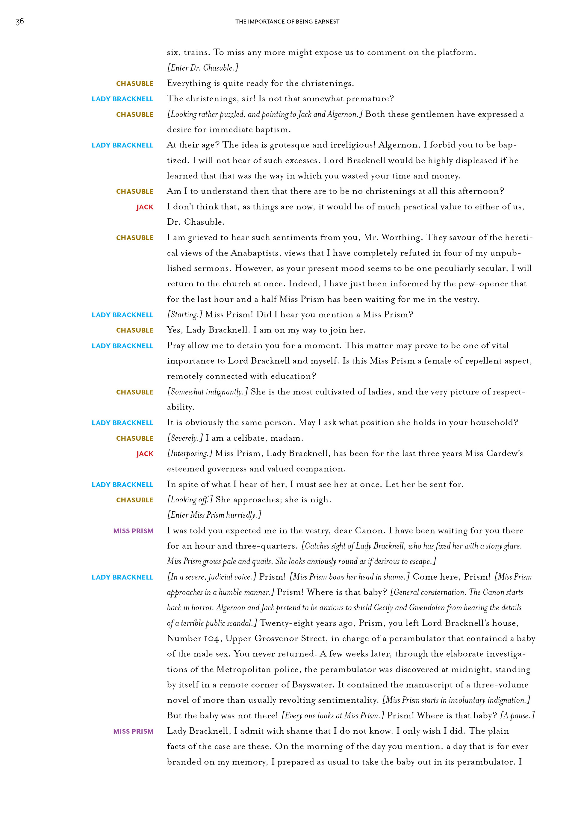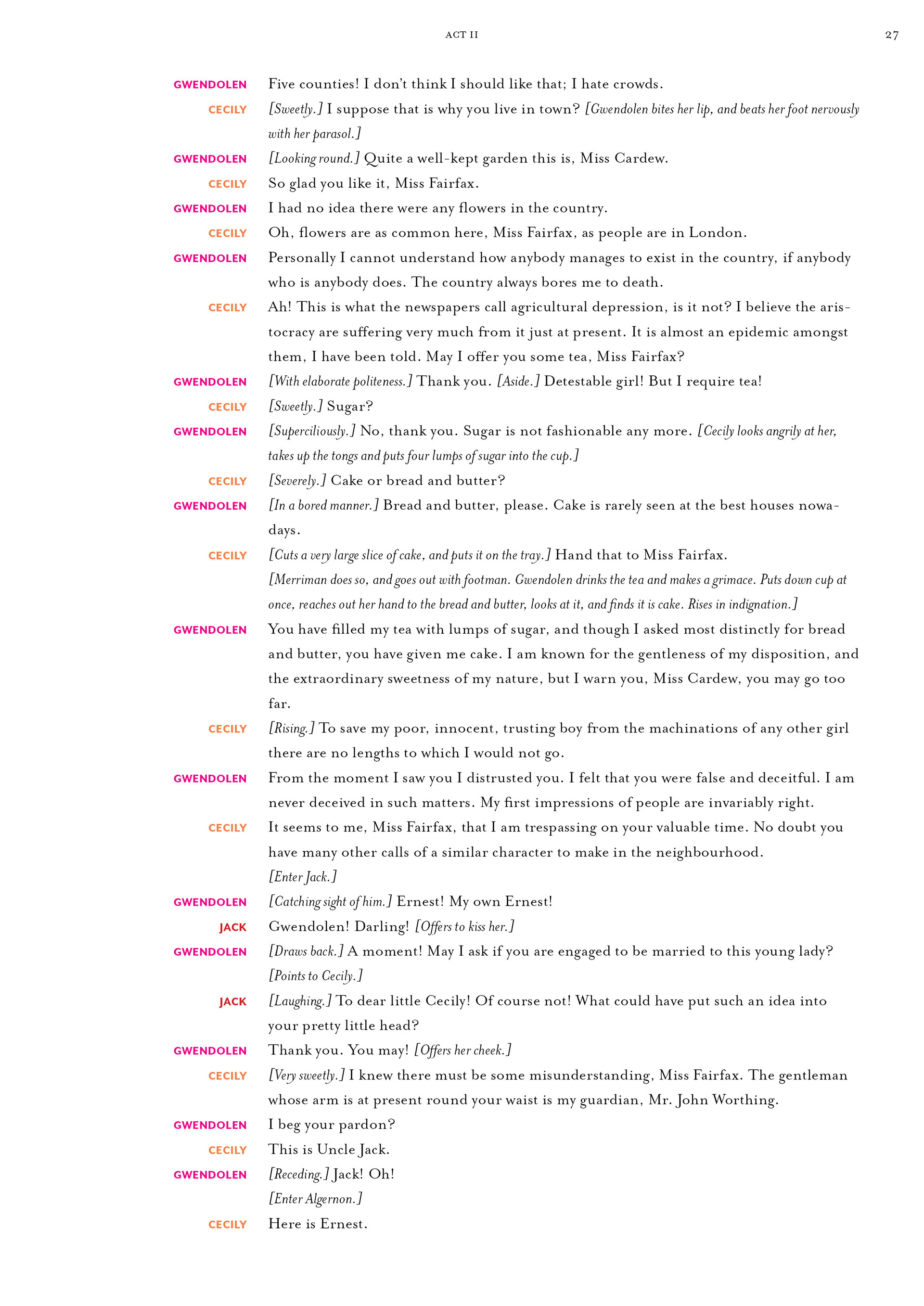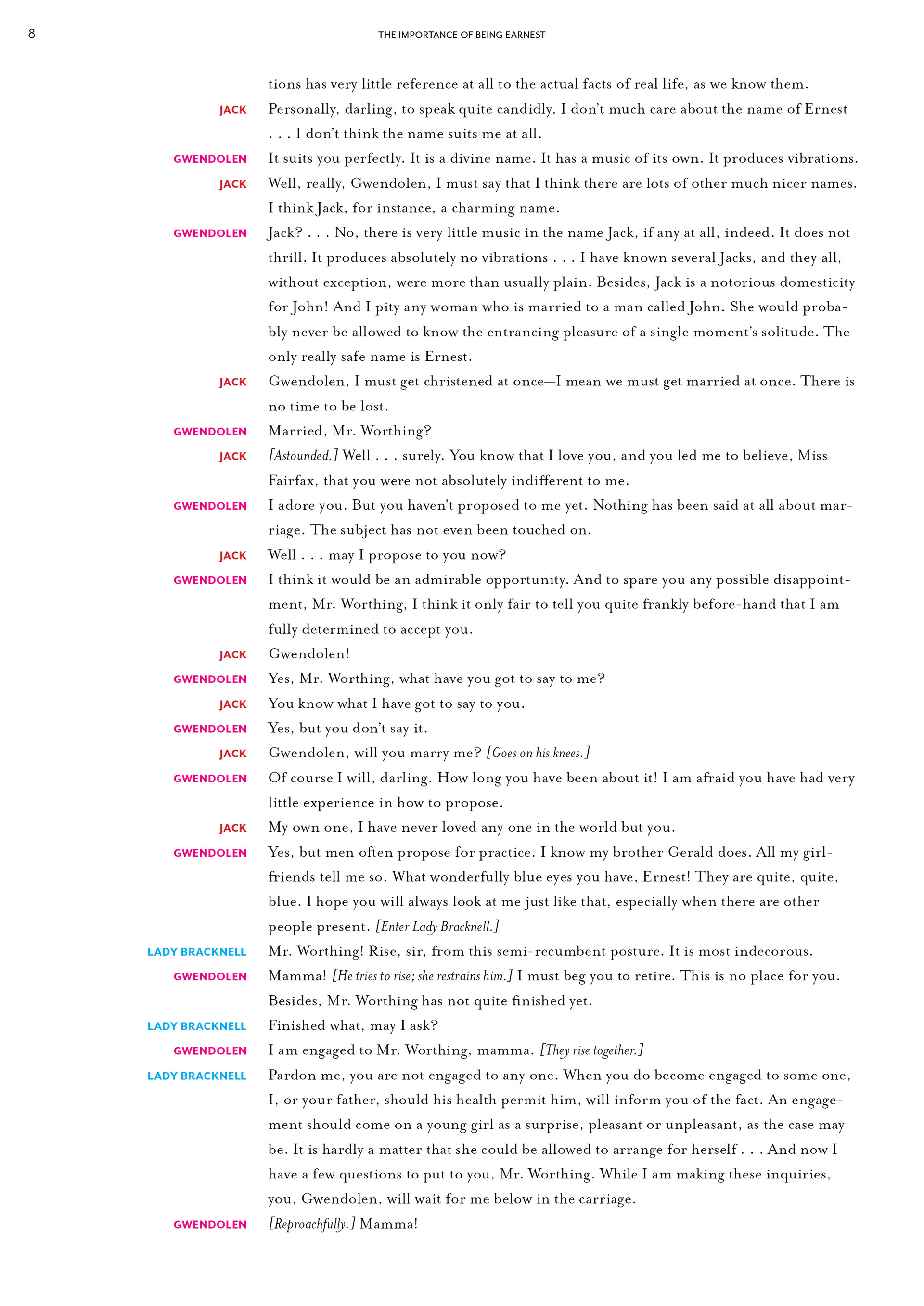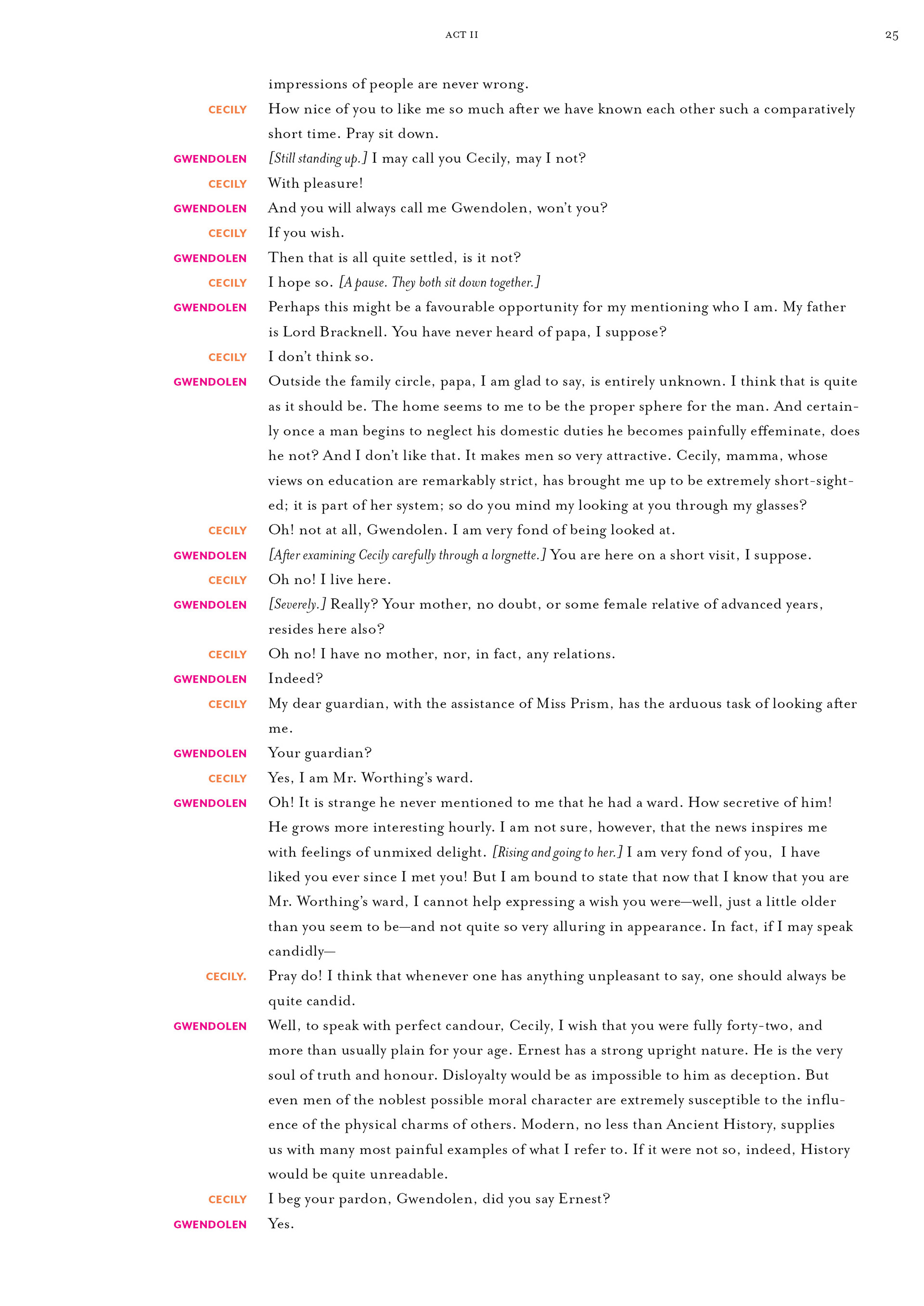I wanted the challenge of typesetting something longer than just a speech and more complex than just flowing text. I decided to set Oscar Wilde's play "The Importance of Being Earnest." Typefaces used were Mr. Eaves and Mrs. Eaves. The characters have individual colors assigned to them to facilitate reading and understanding.