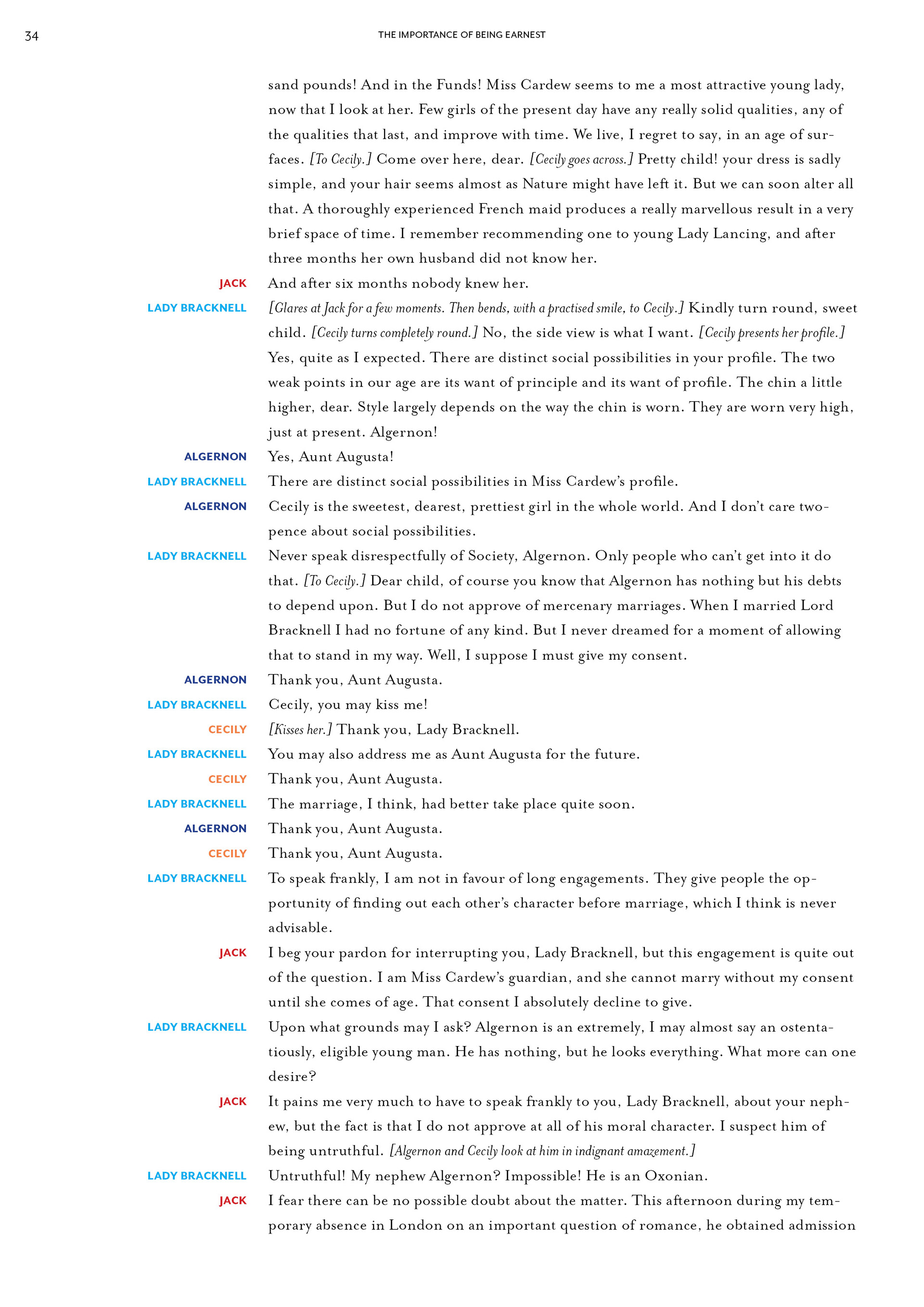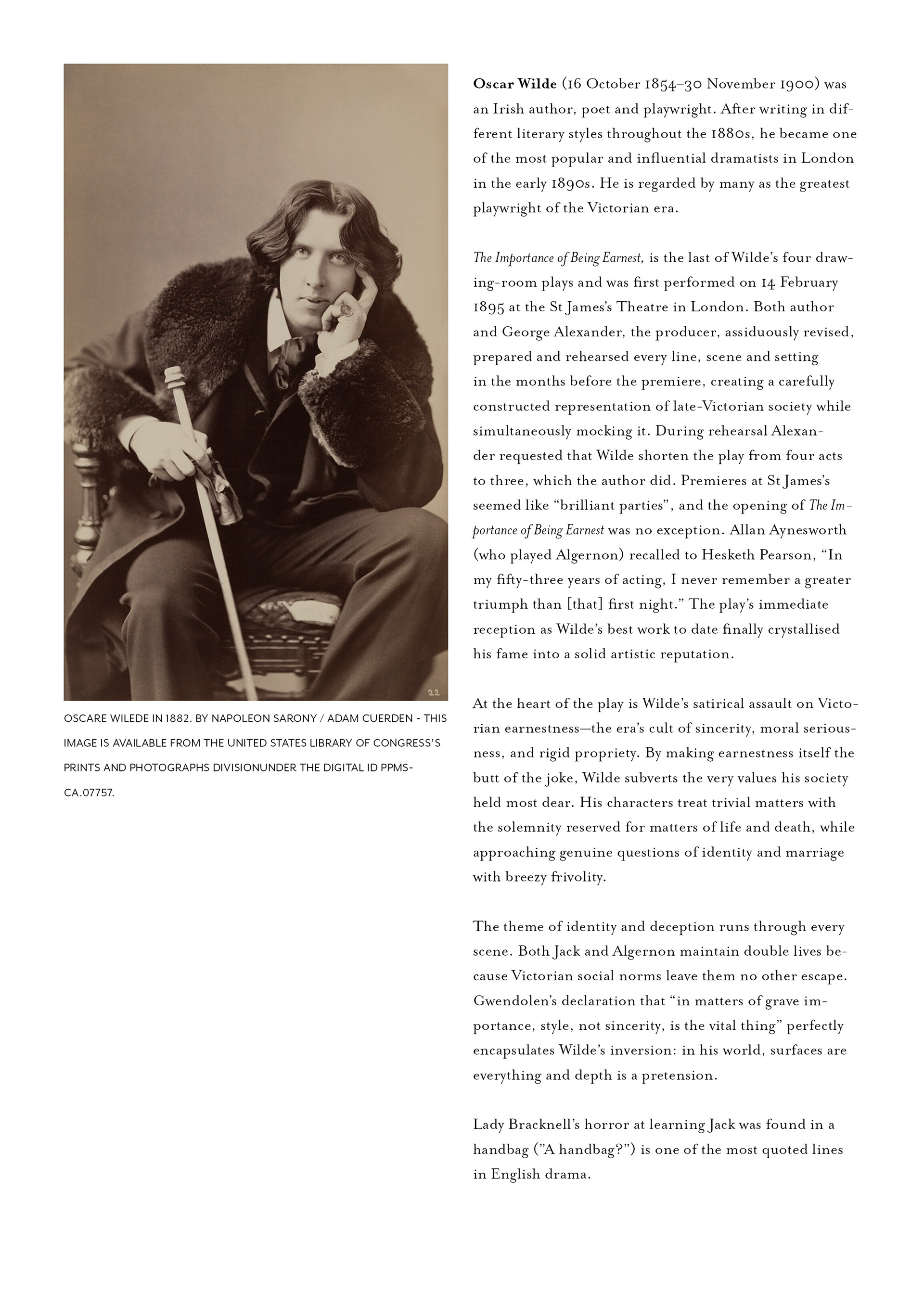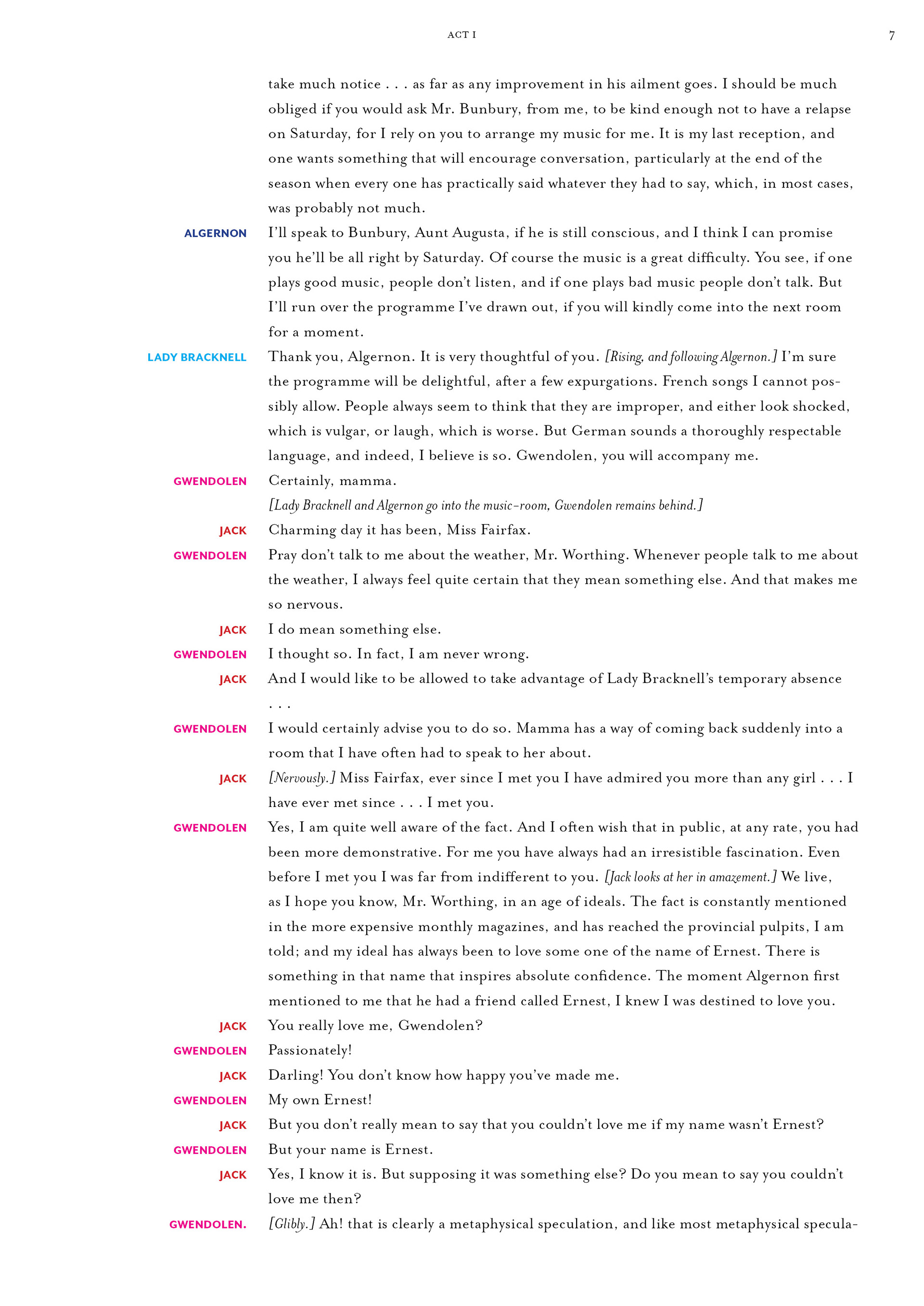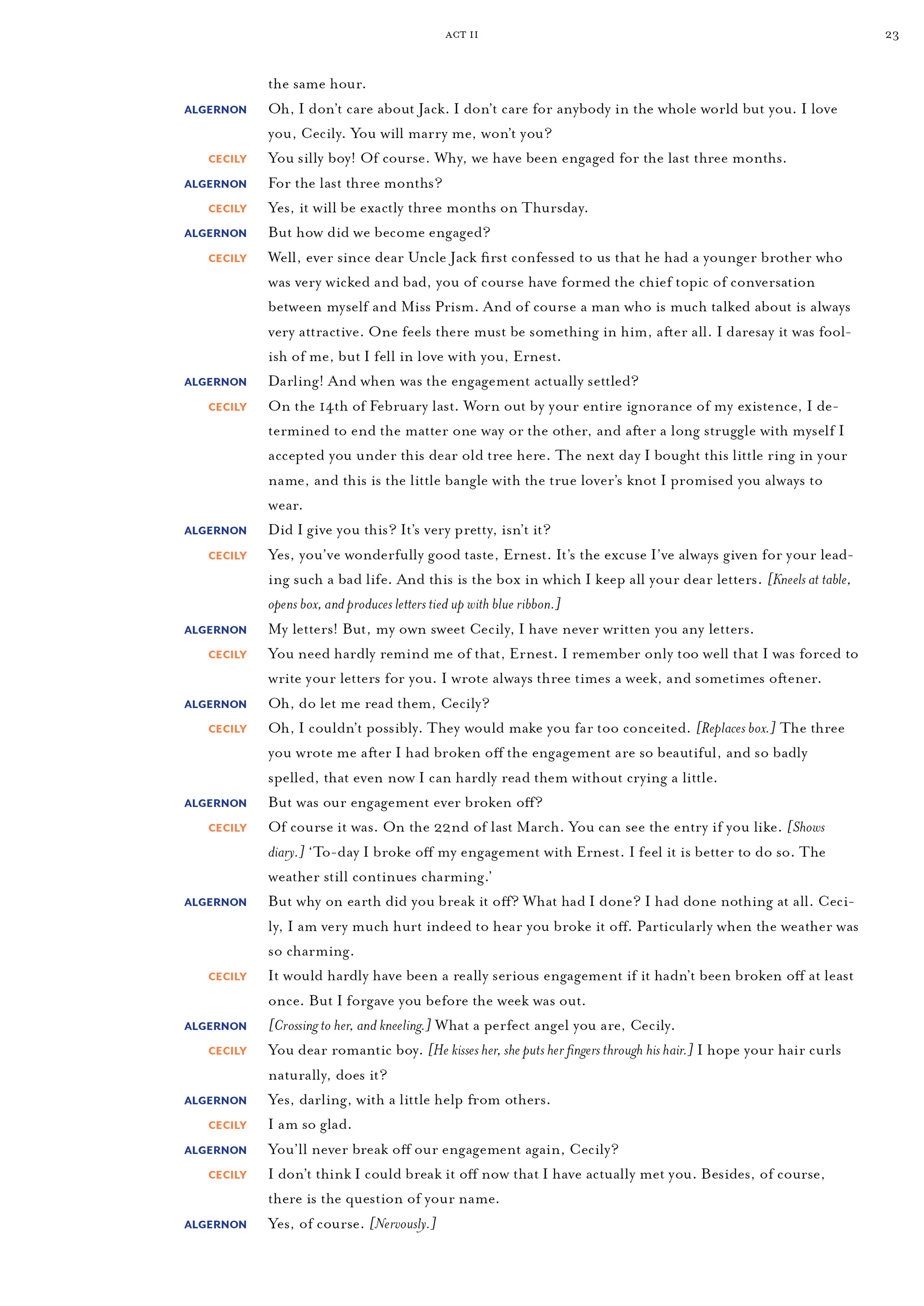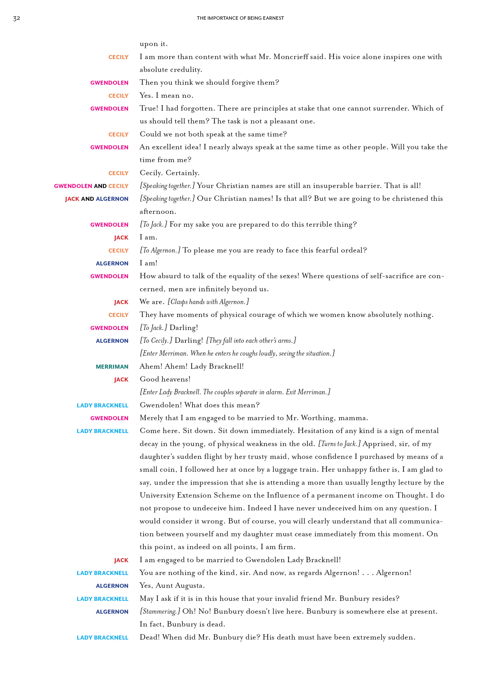 I wanted the challenge of typesetting something longer than just a speech and more complex than just flowing text. I decided to set Oscar Wilde's play "The Importance of Being Earnest." Typefaces used were Mr. Eaves and Mrs. Eaves. The characters have individual colors assigned to them to facilitate reading and understanding.
