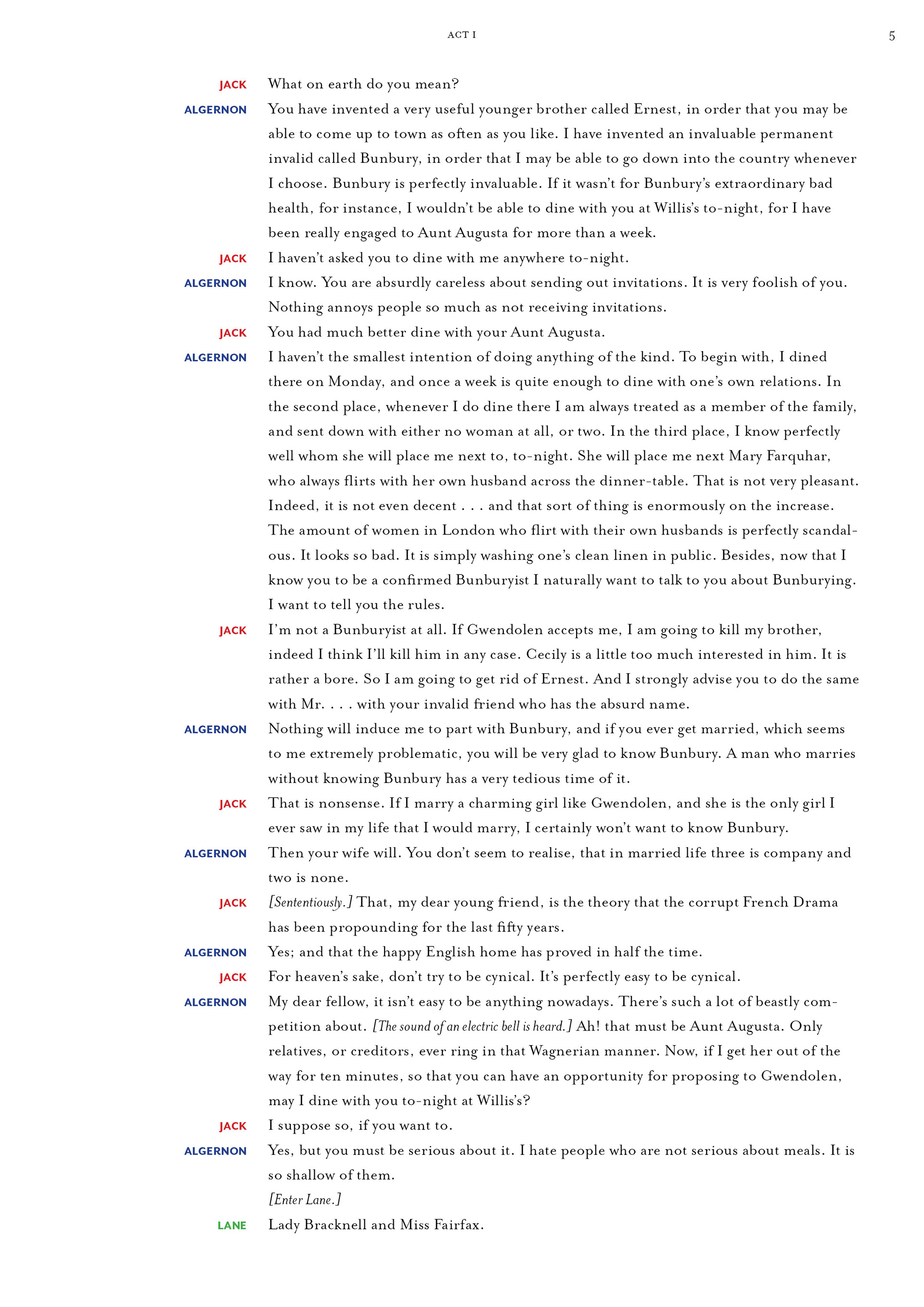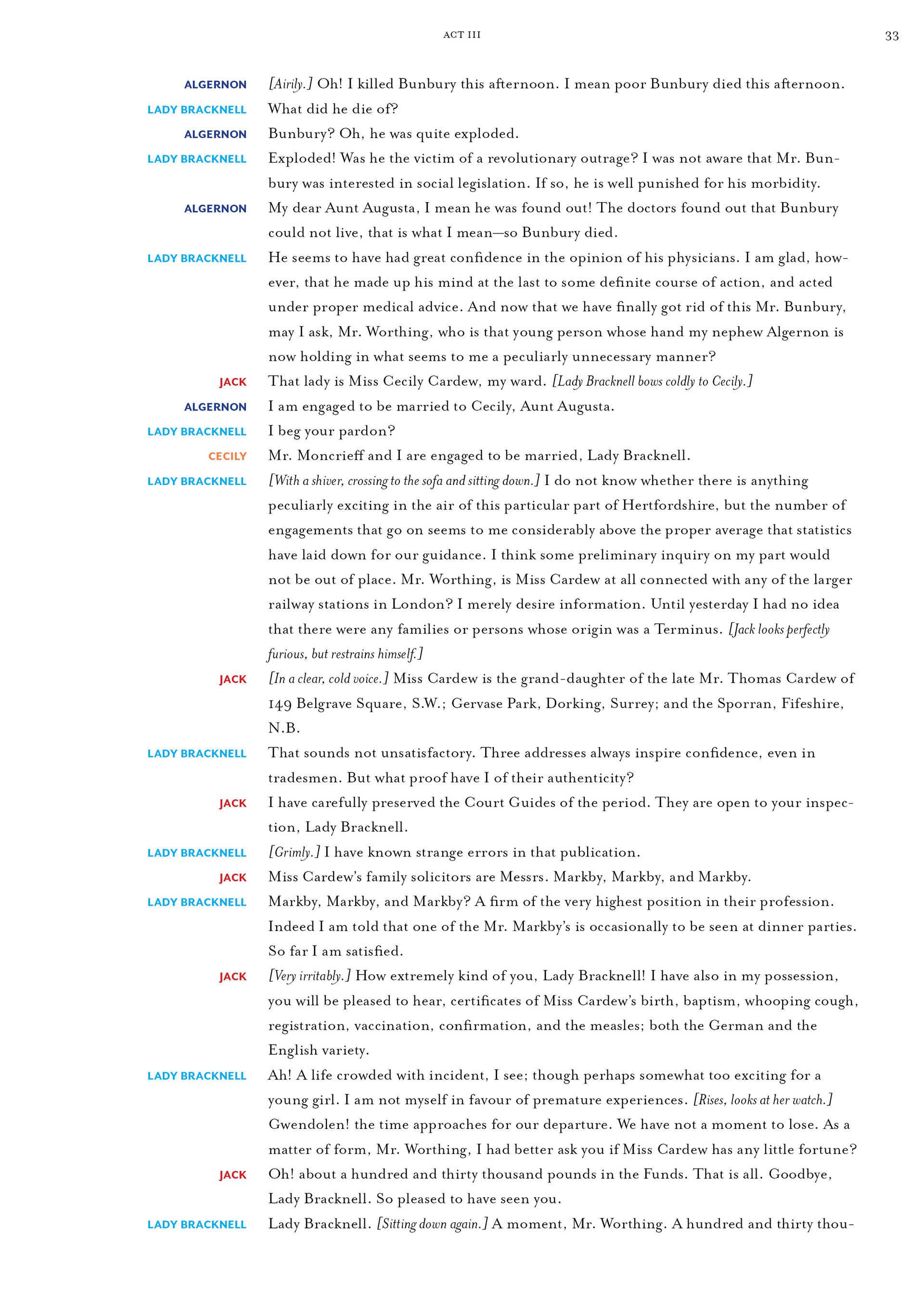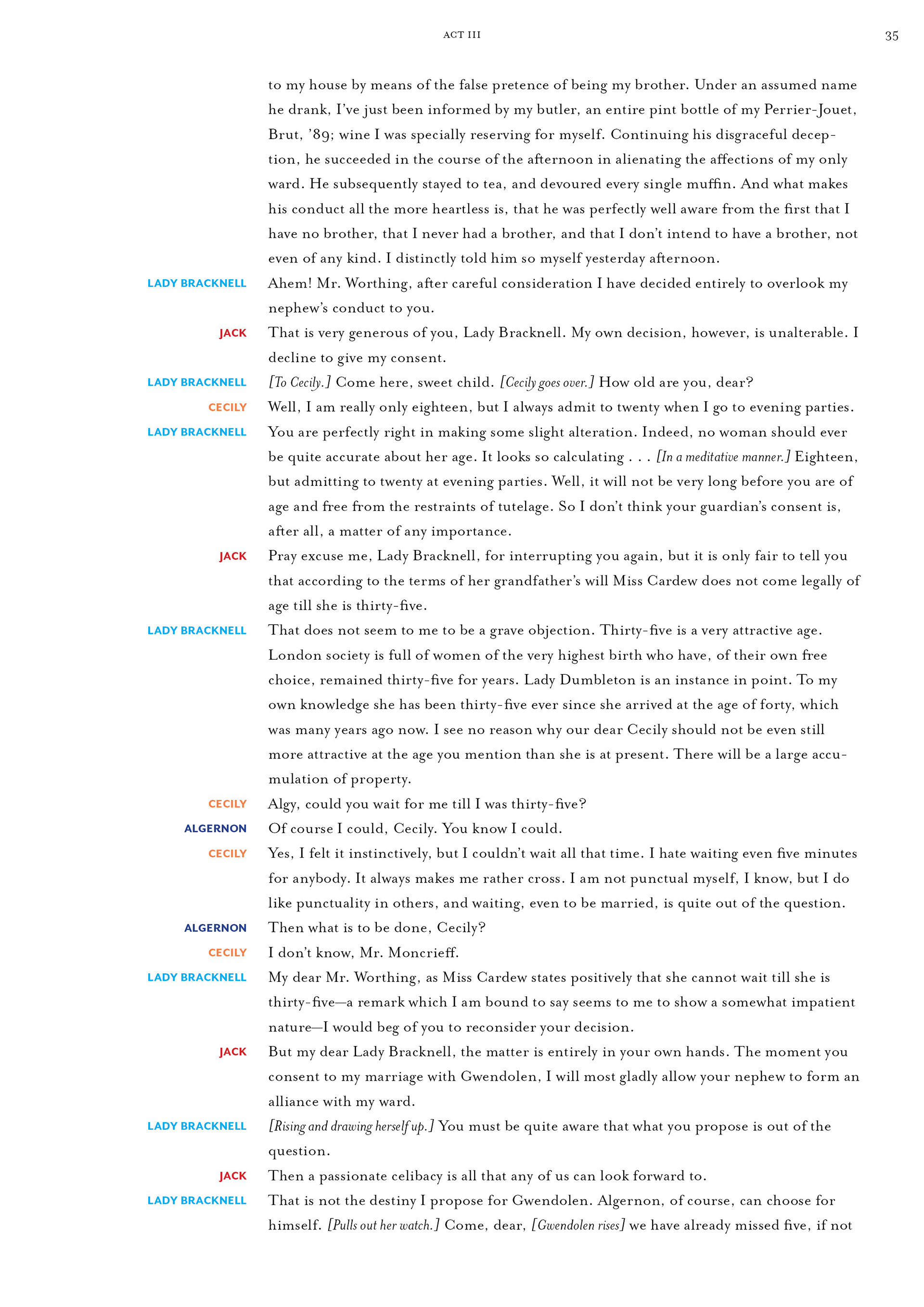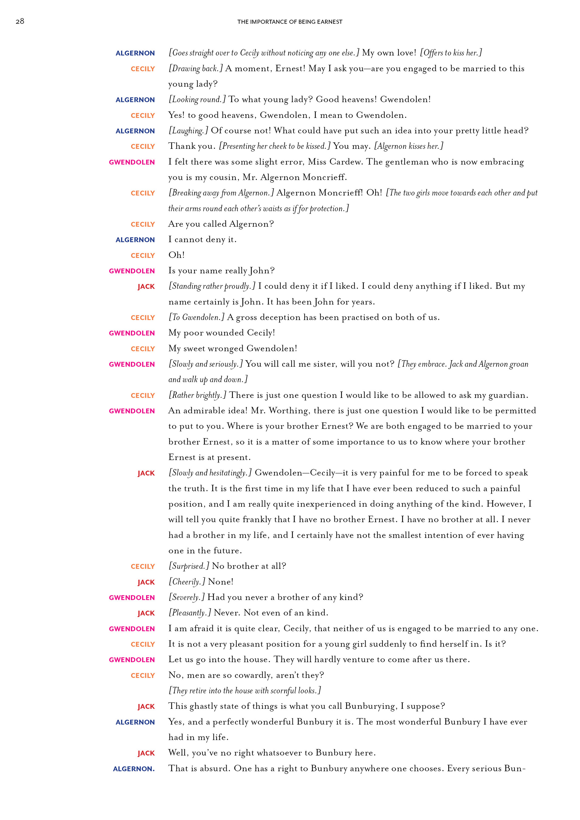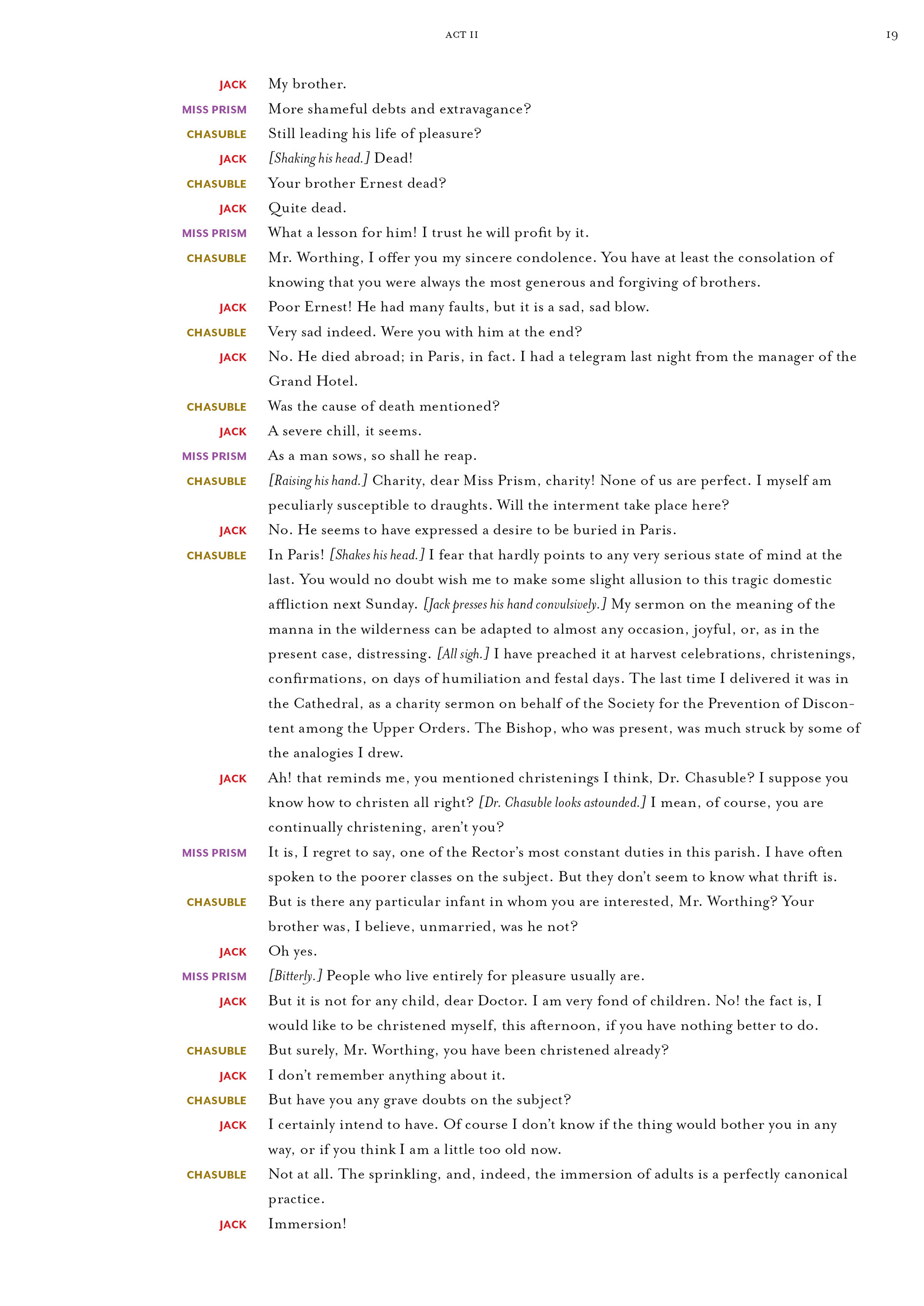 I wanted the challenge of typesetting something longer than just a speech and more complex than just flowing text. I decided to set Oscar Wilde's play "The Importance of Being Earnest." Typefaces used were Mr. Eaves and Mrs. Eaves. The characters have individual colors assigned to them to facilitate reading and understanding.